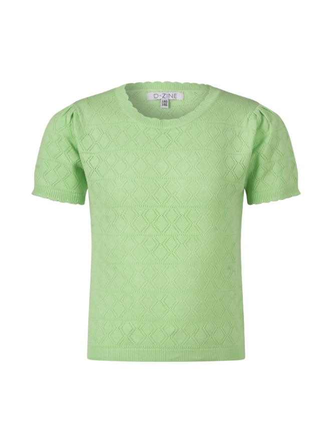 Dit shirt met korte mouw heeft een ajour patroon met rond de hals en uiteinde mouwen een afwerking met halve rondjes.