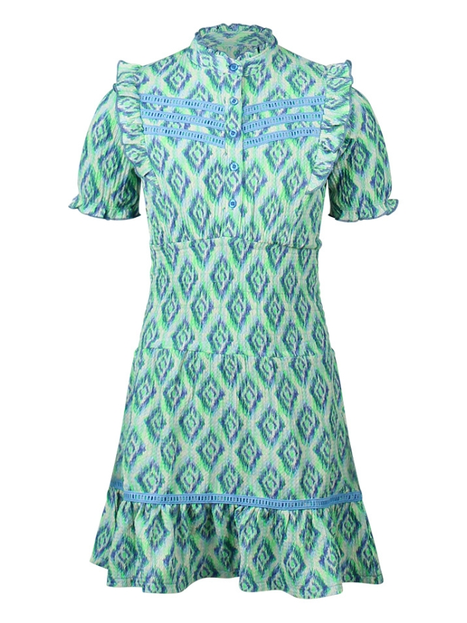 Dit jurkje met ruches rond de hals en over de schouder heeft een ikatdesign. In de middel heeft dit jurkje een brede crincle band met elastiek. Er is ook een rokje, broek, shirt en short in dezelfde print verkrijgbaar. Art. nummers Rokje Z80057 Broek Z80058 Shirt Z80059 Short Z80060