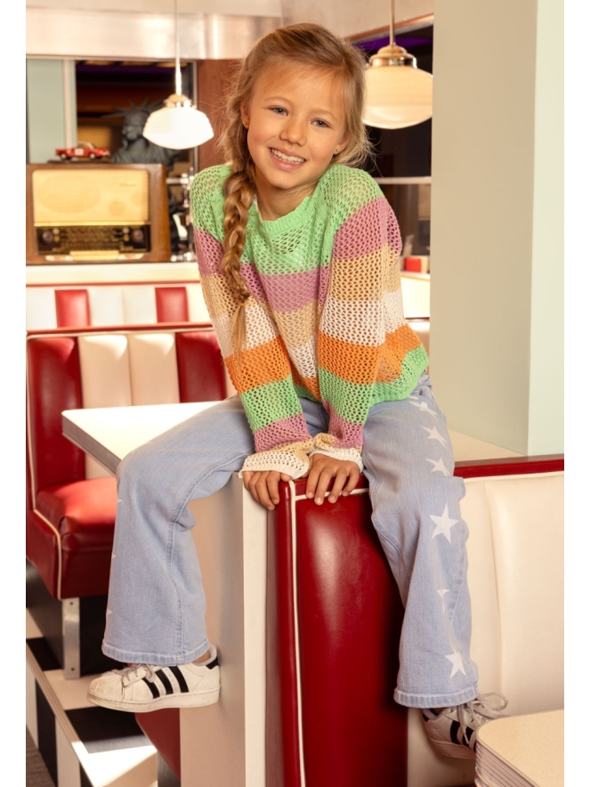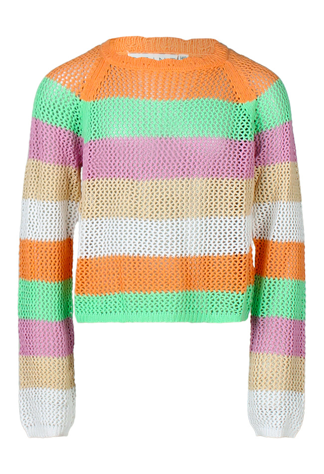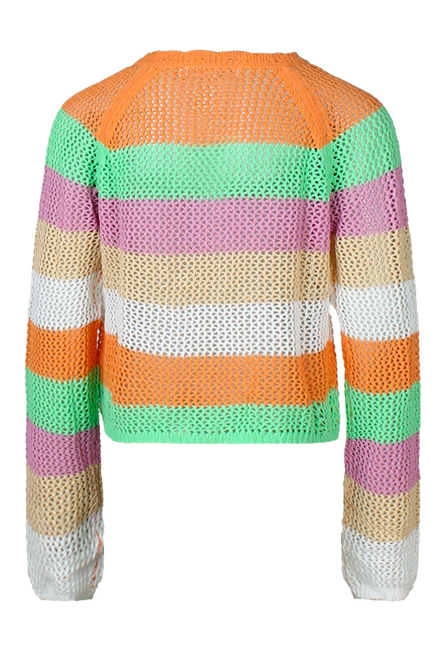 Deze trui is een korter model en van mesh. Dat betekend dat hij doorschijnend is. Daarom kan er het beste iets onder gedragen worden. Let op, deze trui heeft extra lange mouwen.