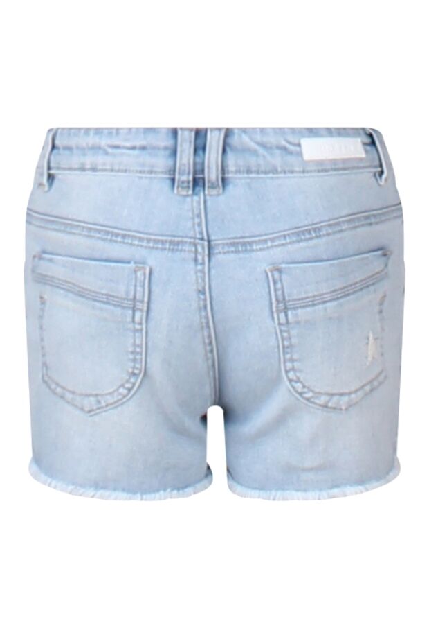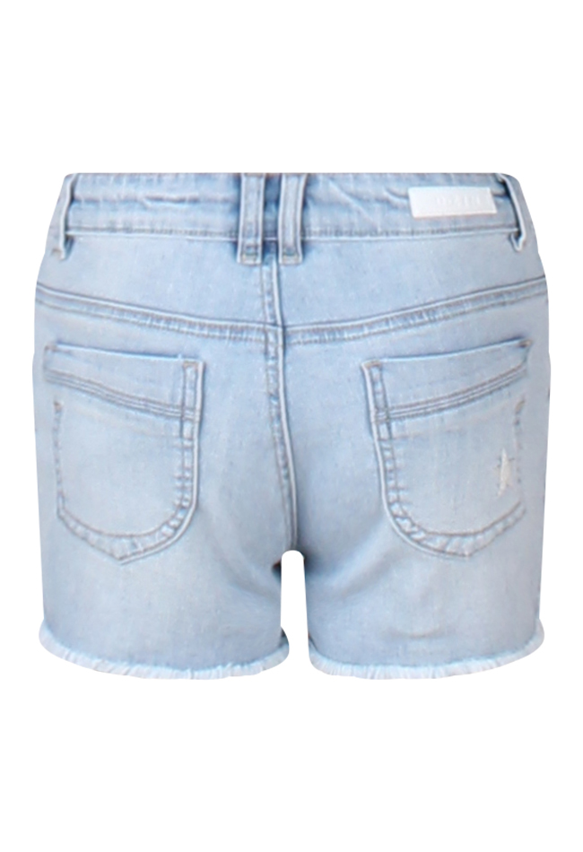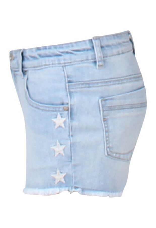 Deze denim korte broek heeft geborduurde sterren op de zij en een gerafelde onderkant. De taille is aan de binnenkant verstelbaar.