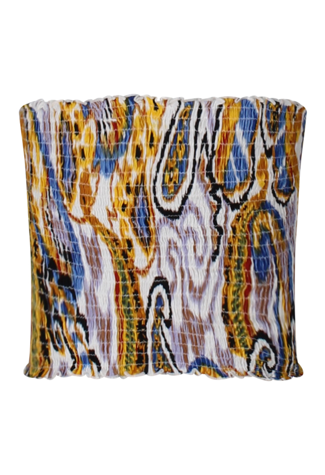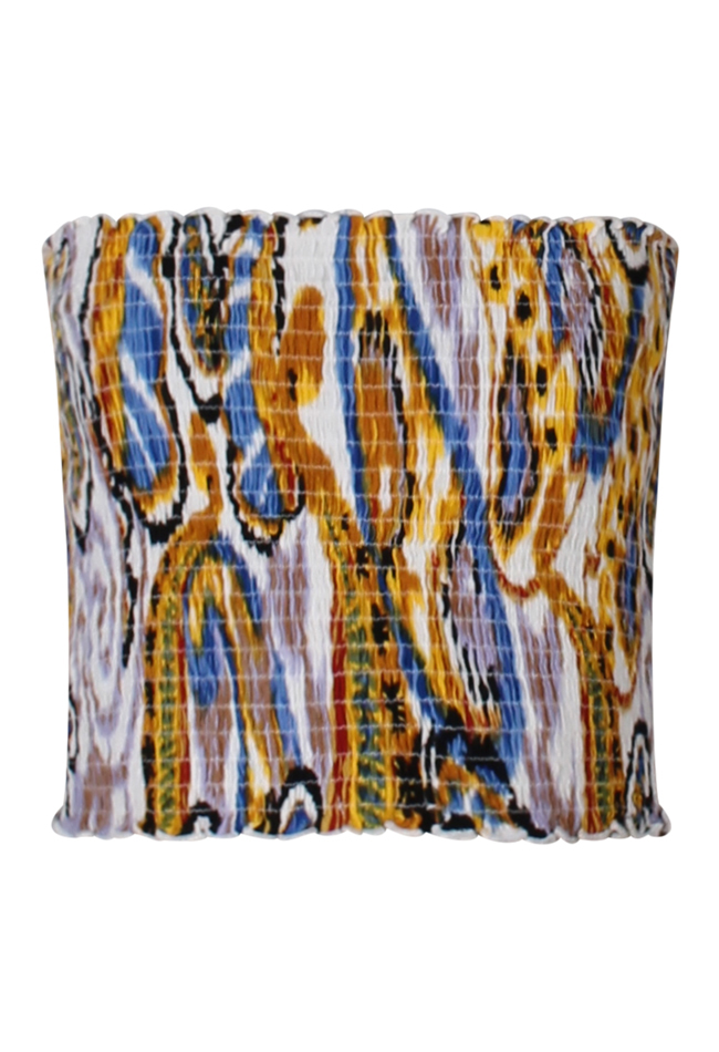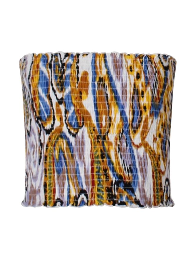 Deze nauwsluitende top bestaat uit een brede smockband. Cropped fit en zonder schouderbandjes. Leuk te combineren met het bijpassende rokje! Ter indicatie, de hoogte van de top met maat 128/134 is 18 cm.