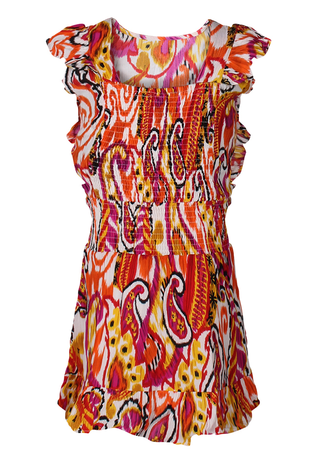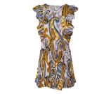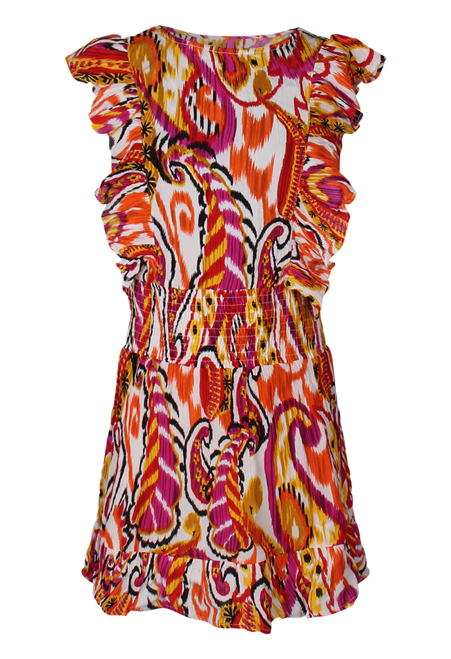 Time to shine! Dit zomerse jurkje voor meisjes van D-Zine heeft een frisse kleurrijke Ikat print met vierkante hals. Net even wat anders! In de taille zit een brede elastische smockband. Dit jurkje is luchtig voor zomerse dagen, heeft een dun katoenen onderrokje en brede schouderbandjes met ruche. Toppertje!