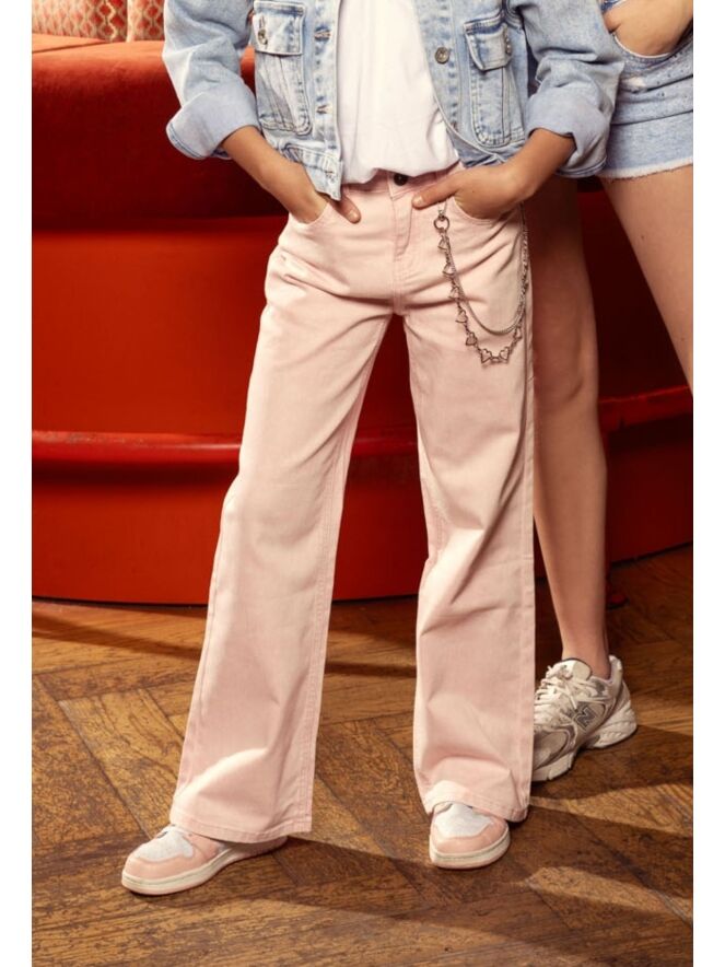 Stoere spijkerbroek in blauw en rose! Met een leuke ketting die er ook makkelijk afgehaald kan worden met een clipje. De broek heeft een rechte broekspijp en combineer je leuk met een sneaker en T-shirtje of top.