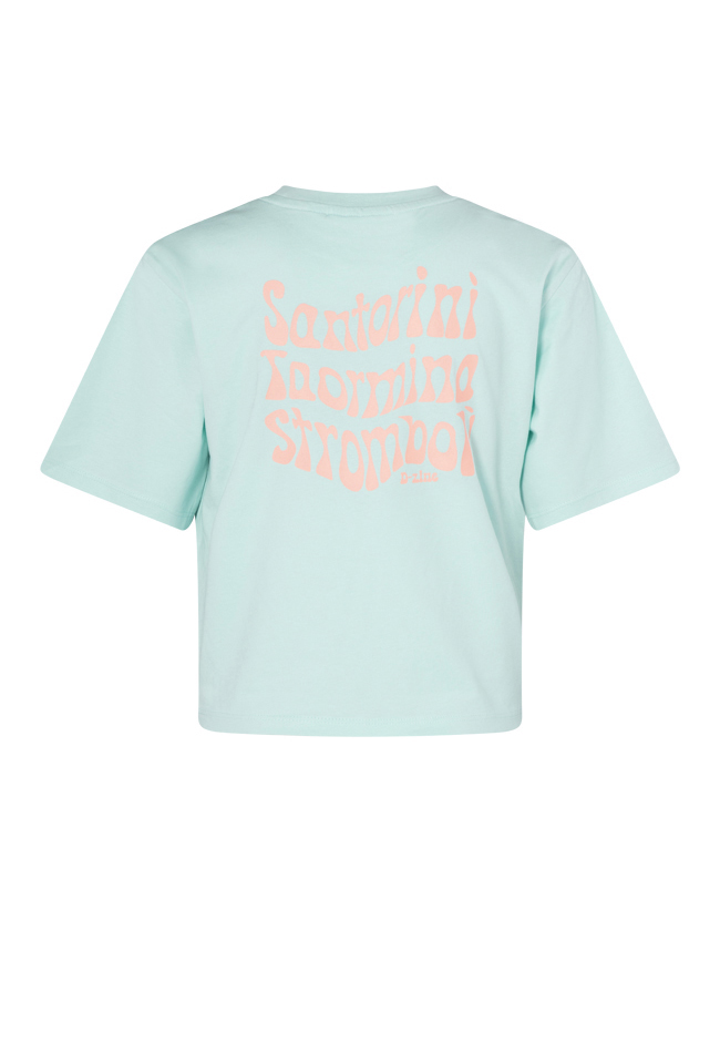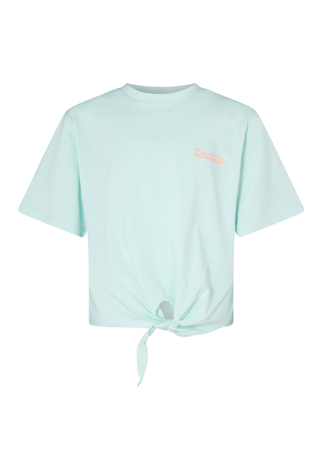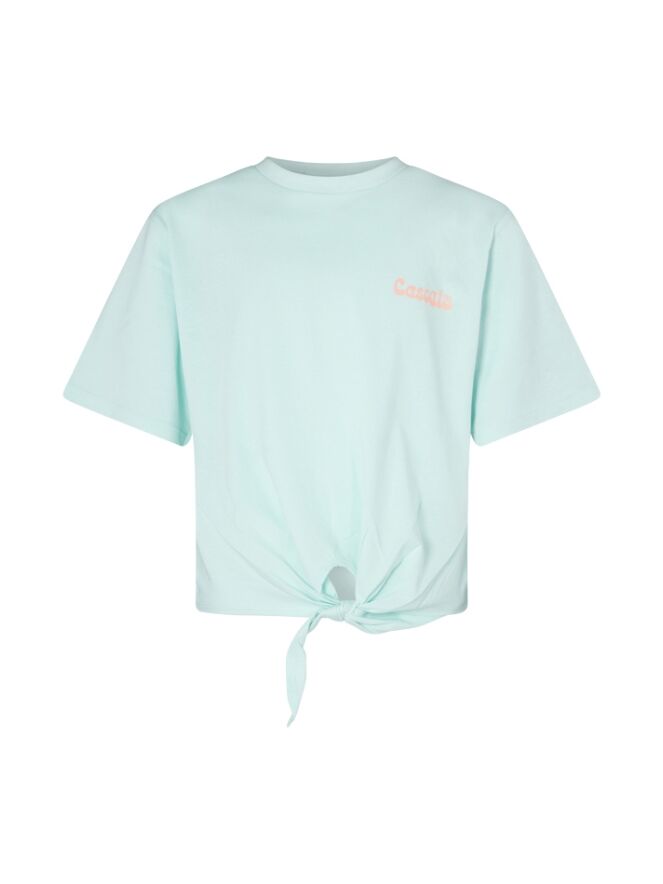 Dit leuke meisjes T-shirt is een echte eyecatcher! De opvallende rugprint en geknoopte details geven het shirt een speelse, trendy look.