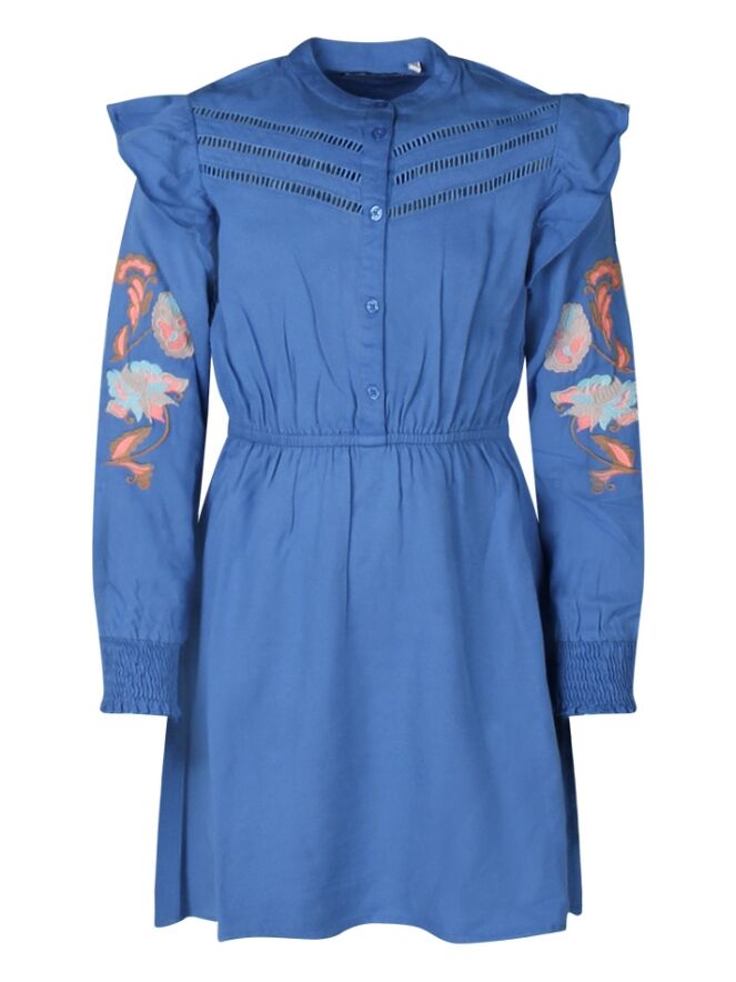 Laat de zomer maar komen! Met dit mooie jurkje steel jij de show! Met bloemenborduursel op de mouwen en een bovendeel dat sluit met knoopjes.