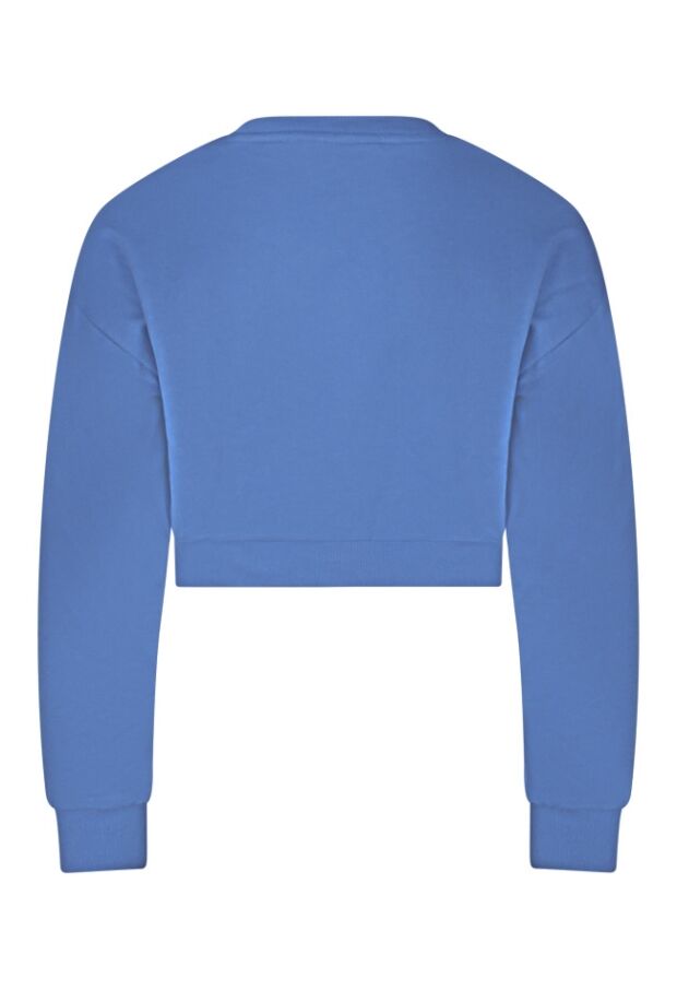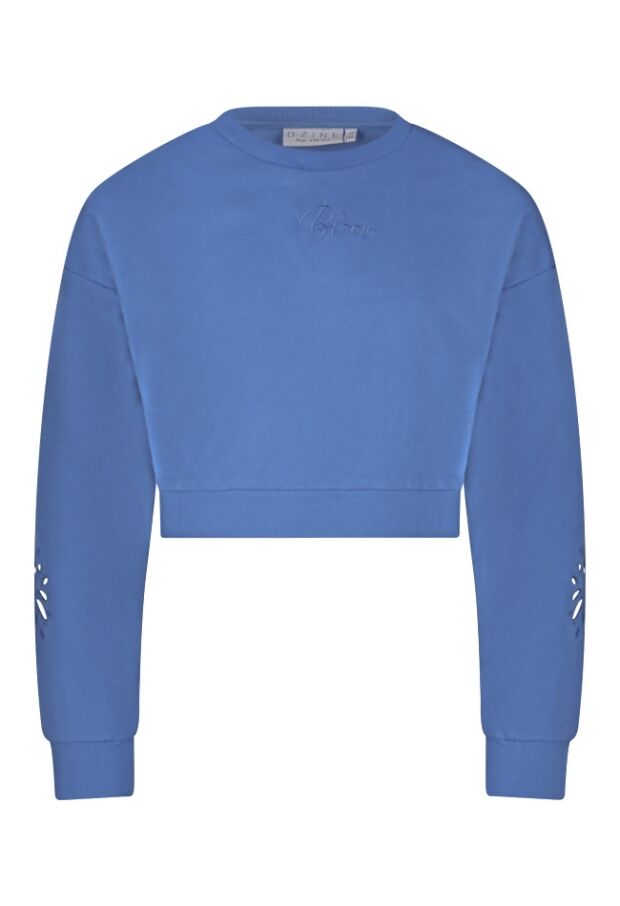 Bloom! Deze sweater is een kort cropped model en heeft een open borduursel onder aan de mouw. Deze is voor de blote buiken dragers een trendy item op zonnige dagen.