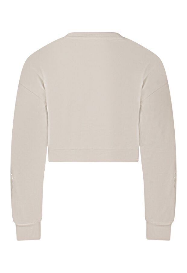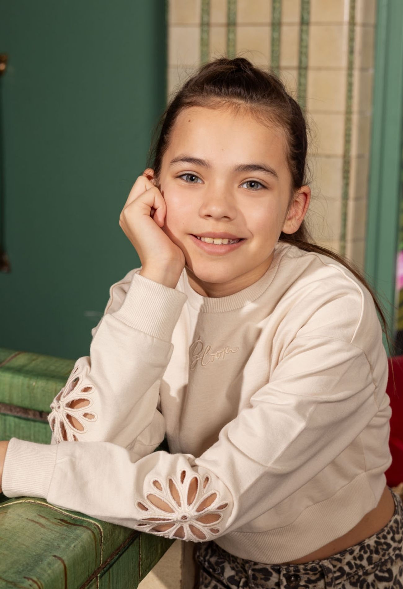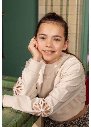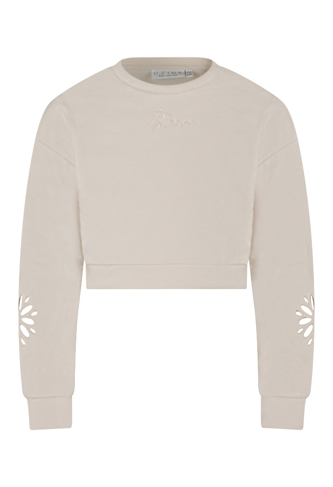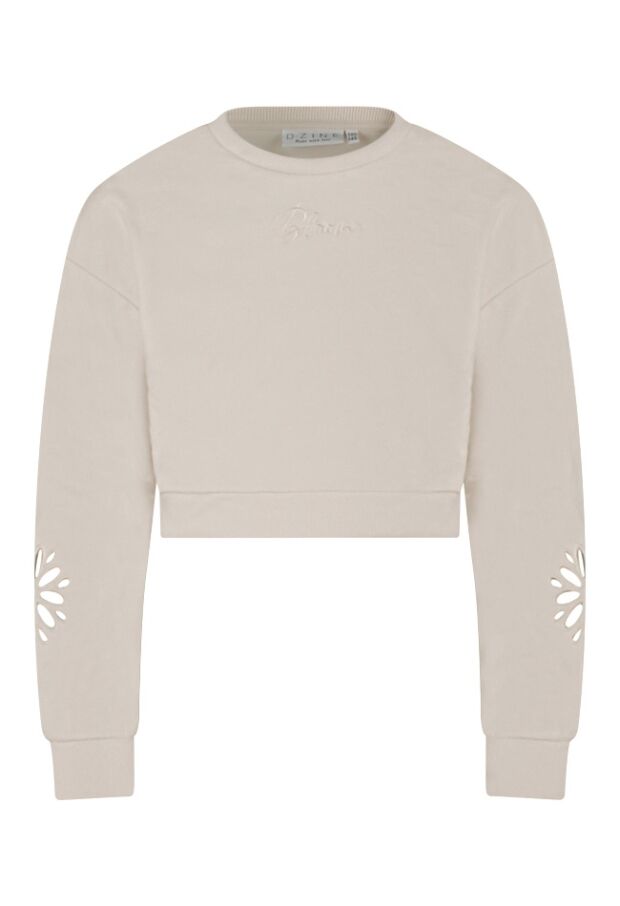 Bloom! Deze sweater is een kort cropped model en heeft een open borduursel onder aan de mouw. Deze is voor de blote buiken dragers een trendy item op zonnige dagen.