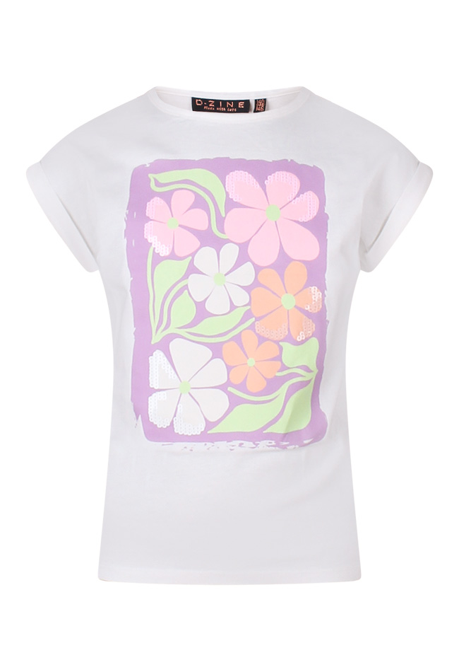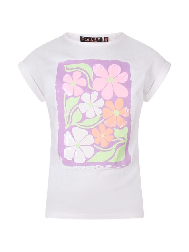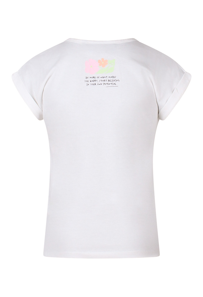 Met dit vrolijke T-shirt steelt jouw kleine meid de show! Met voorop een grote print en pailletten. Achterop een klein printje bovenin. Leuk te combineren met een spijkerbroek of kortebroek, skort of rok!