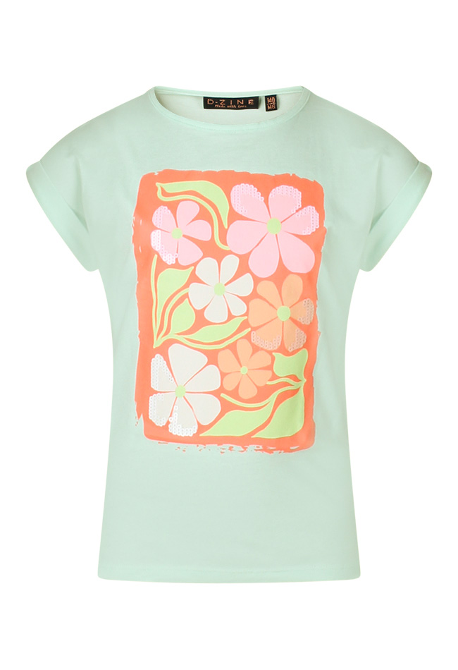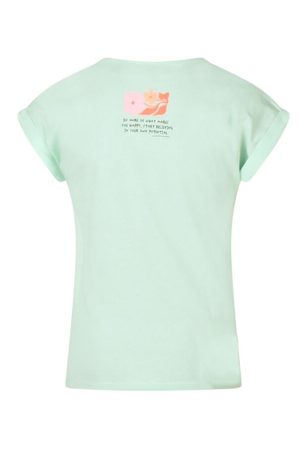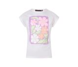 Met dit vrolijke T-shirt steelt jouw kleine meid de show! Met voorop een grote print en pailletten. Achterop een klein printje bovenin. Leuk te combineren met een spijkerbroek of kortebroek, skort of rok!