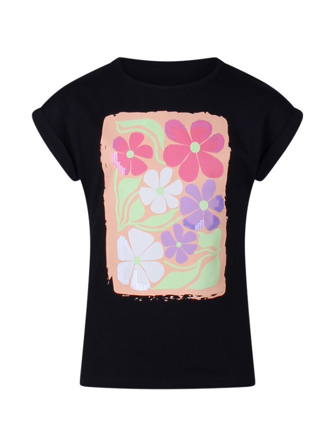 Met dit vrolijke T-shirt steelt jouw kleine meid de show! Met voorop een grote print en pailletten. Achterop een klein printje bovenin. Leuk te combineren met een spijkerbroek of kortebroek, skort of rok!