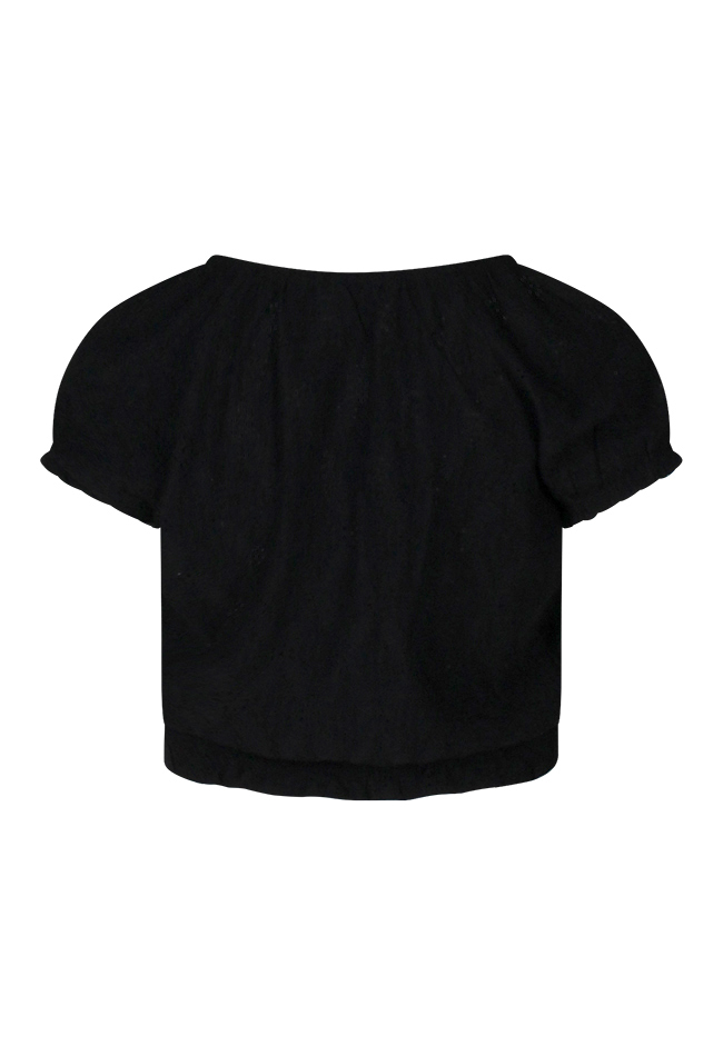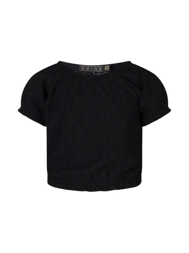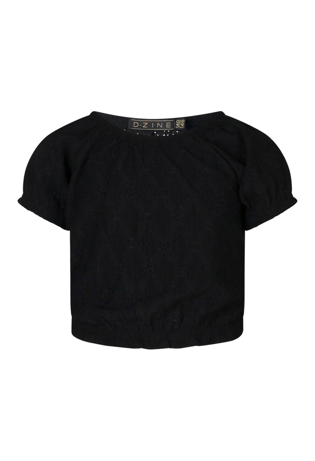 Als het straks echt zomer is is dit je grote favoriet! Deze mooie top met wijde hals heeft een pofmouw en is van een mooie ajour stof. De top is iets korter ofwel cropped en heeft in de middel een elastiek om hem nog iets extra te kunnen laten plooien.