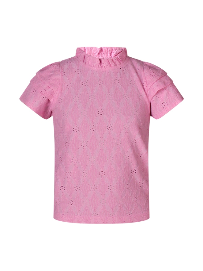Deze fancy ajour top met een watervalmouw heeft een mooie ruche ronde de hals. Dit shirt schijnt een beetje door door de ajour stof. Leuk te combineren met een giletje of spijkerjasje op een rokje of broek kort of lang!