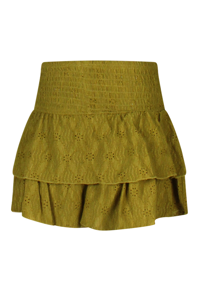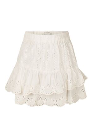 Dit prachtige strokenrokje van ajour met hoge elastische smock taille draagt heerlijk omdat de taille mooi omsluit. Het rokje is kort en heeft daarom een broekje eronder en dat vinden wij super! T-shirtje er op en klaar!
