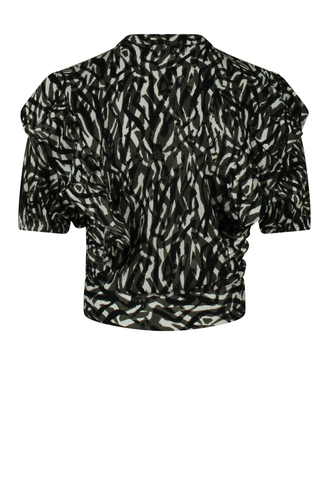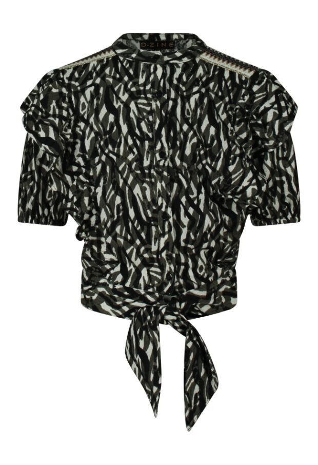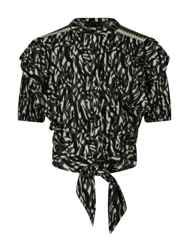 Deze luchtige blouse met dierenprint is een echte eyecatcher. Zowel aan de voor- als achterkant loopt een sierlijke ruffel, en in de taille zorgt een strikdetail voor een speels accent. Gemaakt van zachte crinkle stof en perfect te combineren met de bijpassende korte broek voor een zomerse look, of met de lange broek op koudere dagen!