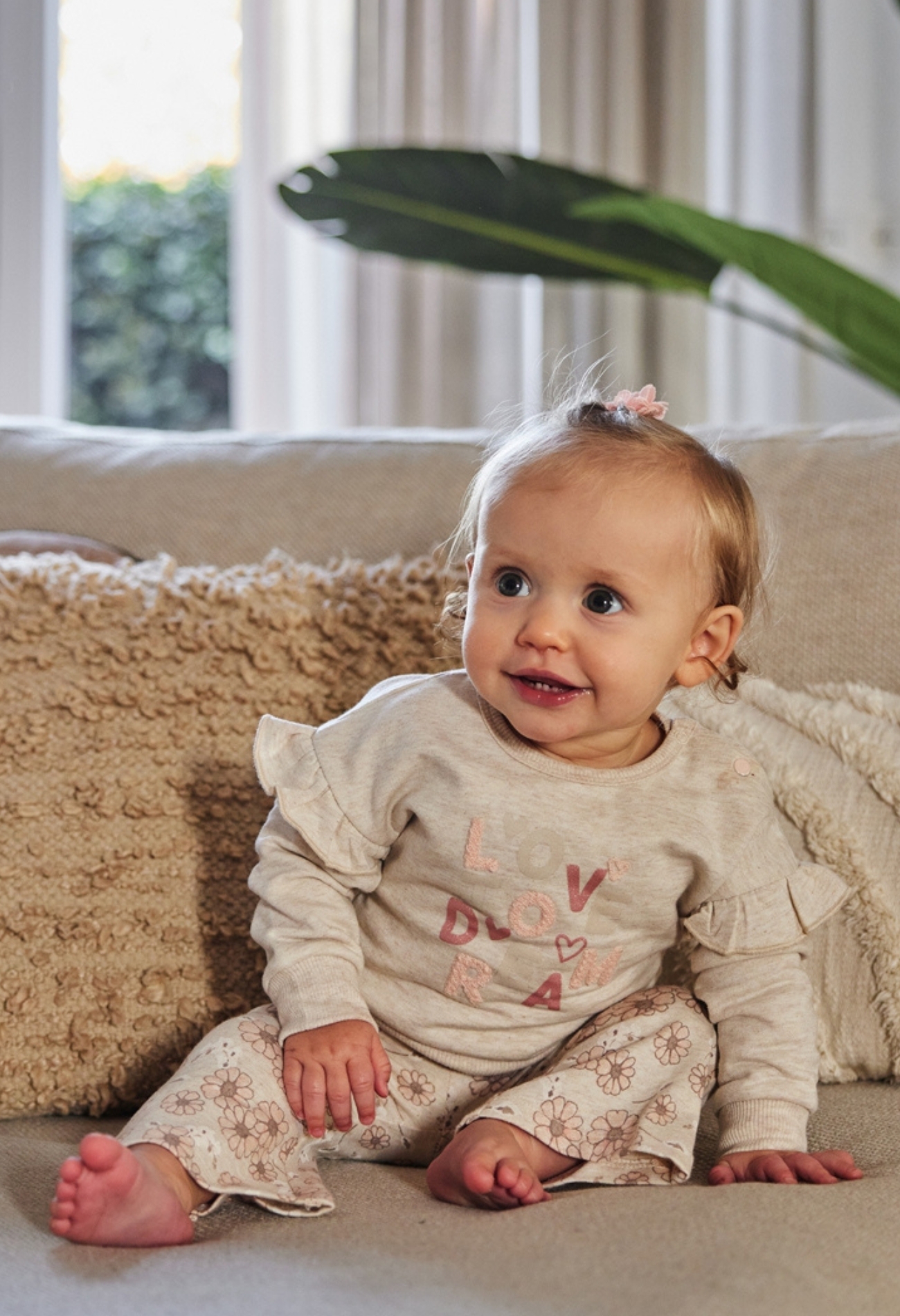 Deze flared broek voor meisjes is uitgevoerd in een zachte roze bloemenprint en is een echte eyecatcher! Extra leuk: er is een bijpassende top verkrijgbaar voor een complete bloemenlook. Perfect om in te stralen! Liever combineren? Draag het broekje ook eens met een blouse of sweater voor een andere, speelse outfit.