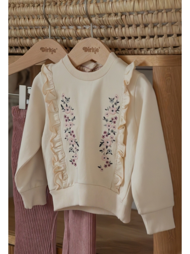 Deze baby meisjes sweater is versierd met prachtig geborduurde bloemen en speelse ruches op de voorkant, wat zorgt voor een lieve en vrolijke uitstraling. Gemaakt van een zachte stof die comfortabel draagt. Combineer hem met een jeans voor een stoere, maar schattige outfit!