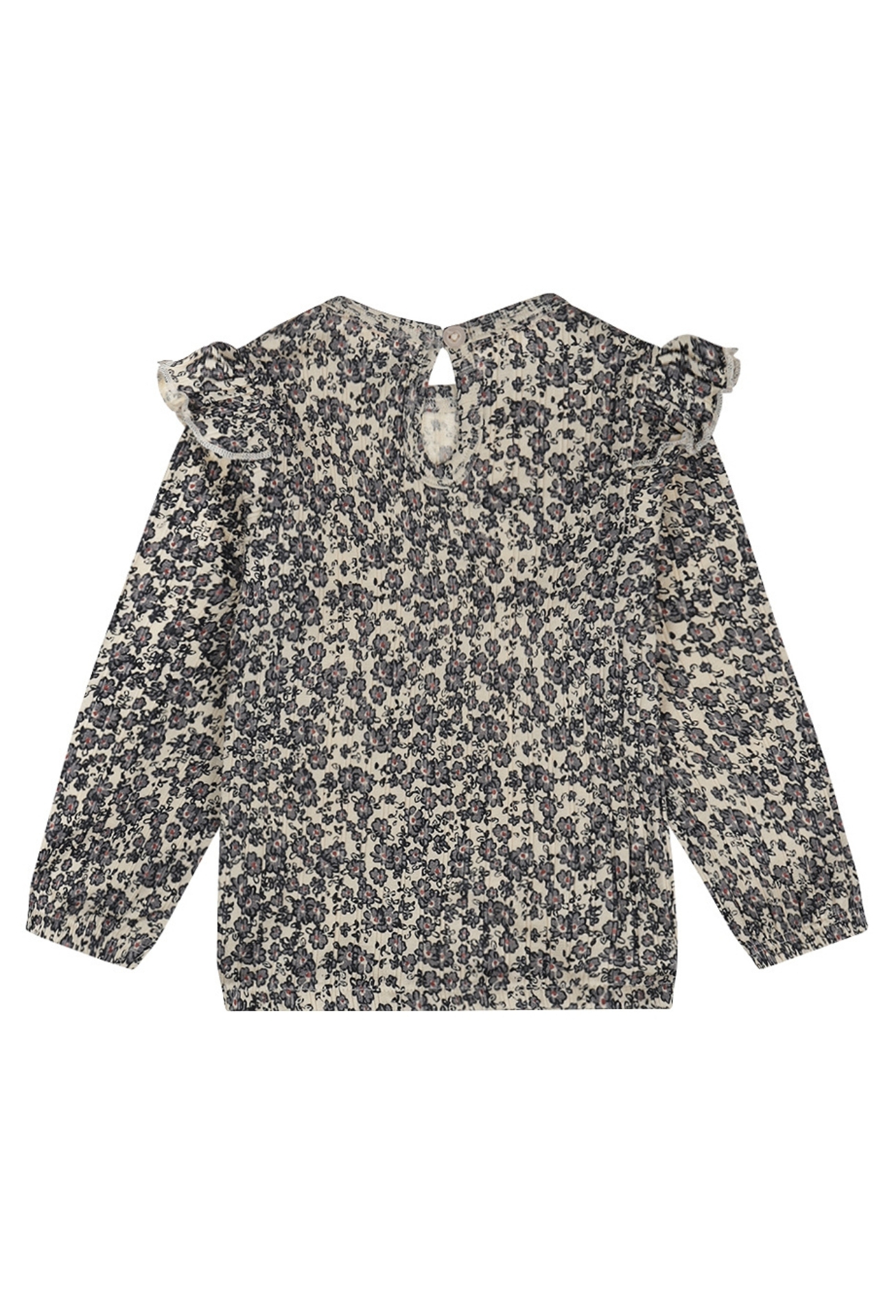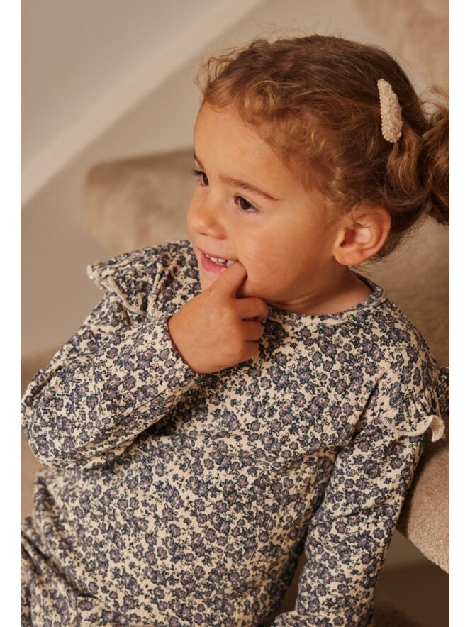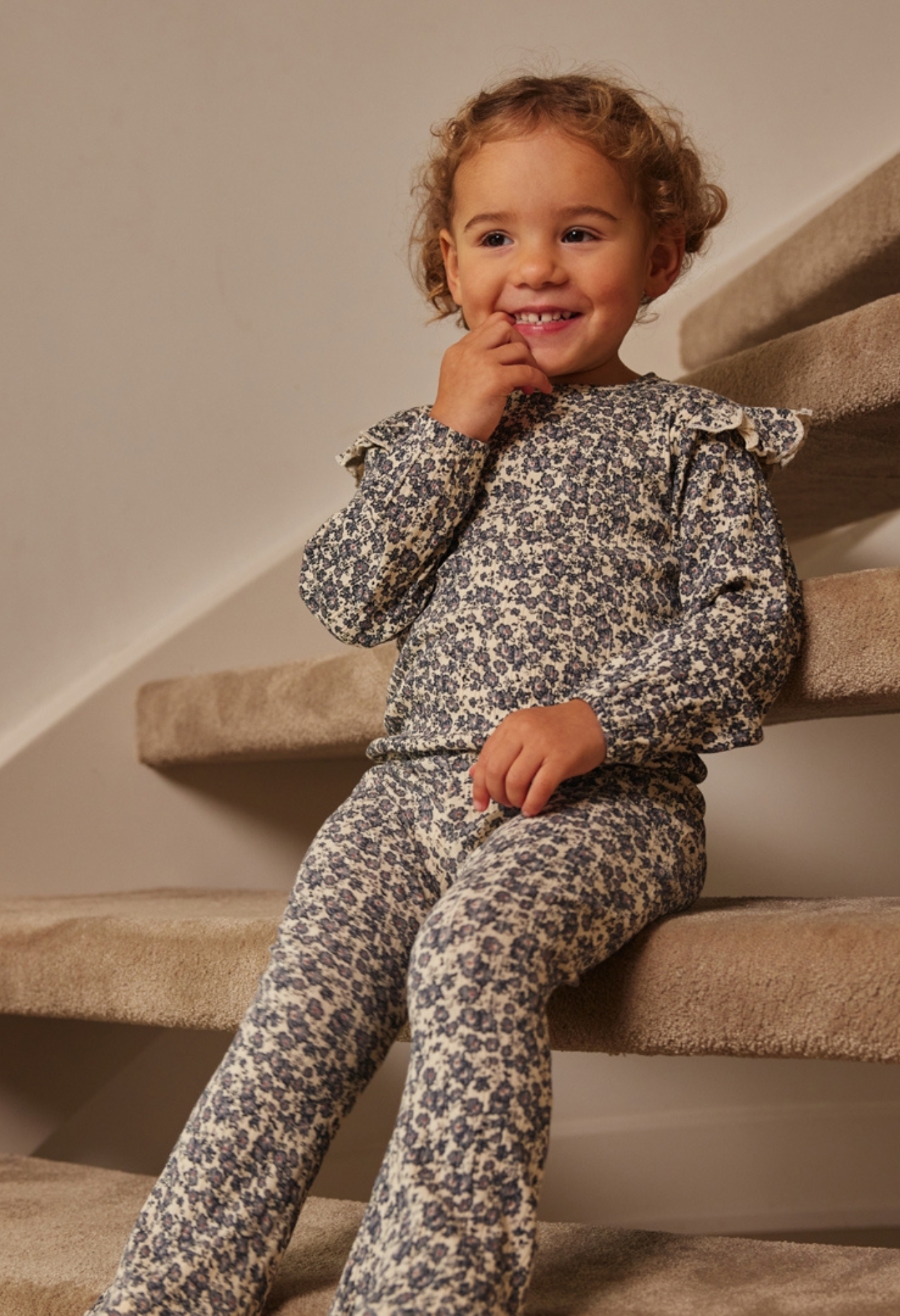 Vrolijk bloemen shirt voor meisjes, gemaakt van een zachte ribstof met een paars bloemenprintje. De ruche op de schoudernaden geeft het shirt een speelse en girly touch. Combineer het met de bijpassende flared broek voor een complete set, of draag het op een jeans voor een casual en comfortabele look!