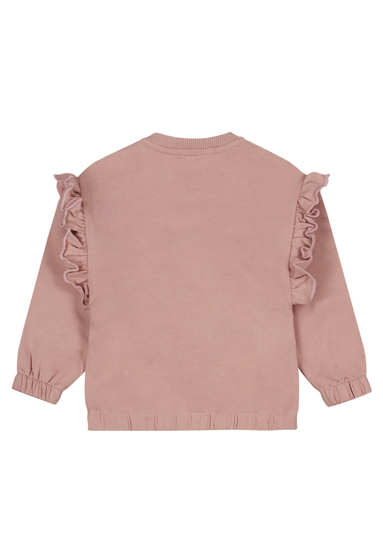 Deze schattige sweater voor baby meisjes is uitgevoerd in een prachtige oudroze mauve kleur. Op de voorkant zitten speelse bloemenpatches en langs de schouders ruches aangebracht voor een extra lieflijke uitstraling. De boord aan de onderkant en mouwuiteinden zijn is elastisch, wat zorgt voor een comfortabele pasvorm. Perfect voor een cozy en stijlvolle look!