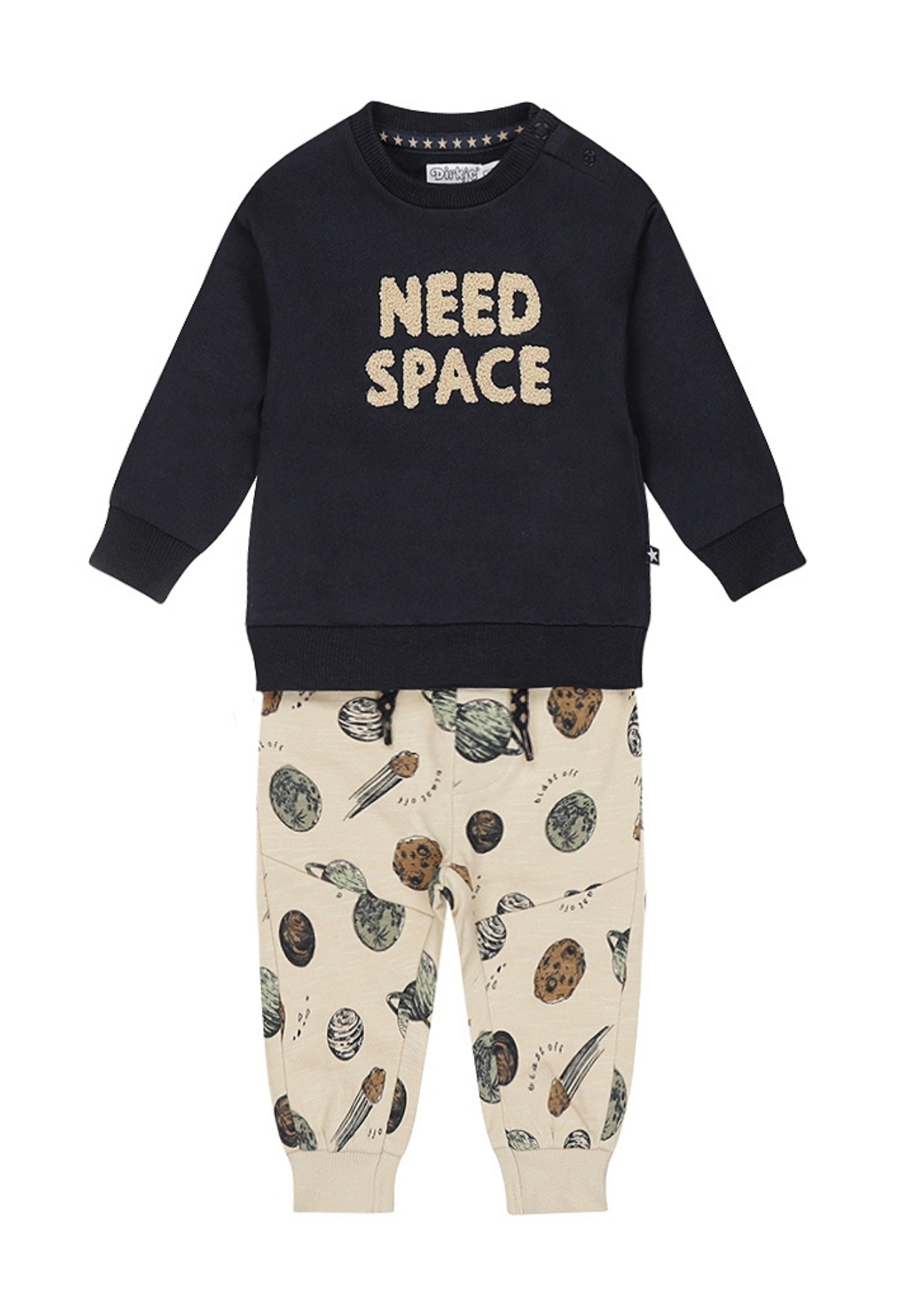 Hoe stoer is deze set met als thema de ruimte! De sweater heeft een zachte teddy tekstprint op de voorkant, helemaal in stijl. Het bijpassende broekje is voorzien van een coole all-over spaceprint. Beide items zijn heerlijk zacht van binnen, waardoor ze niet alleen leuk zijn om te zien, maar ook supercomfortabel om te dragen. Perfect voor kleine avonturiers!
