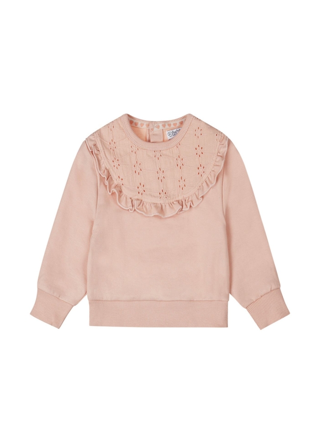 Leuke sweater voor baby meisjes met een broderie rand rond de hals en een leuke ruche. De kleur wordt aangeduid met licht rood maar is echt zacht roze/oud roze.