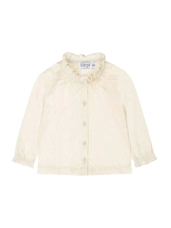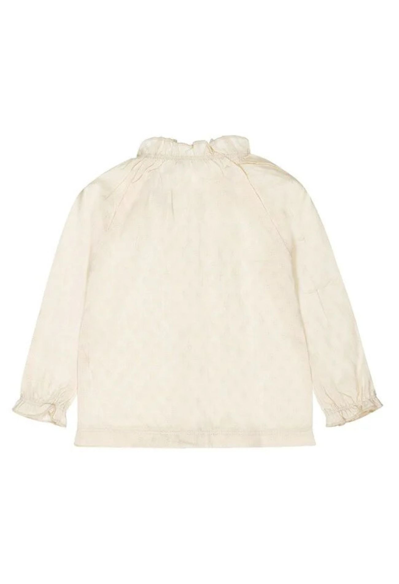 De blouse heeft een klein opstaand kraagje en elastiek aan de uiteinden van de mouwen voor extra comfort. De geborduurde stof geeft de blouse een speelse look. Dankzij de knoopsluiting aan de voorkant is de blouse gemakkelijk aan en uit te doen.