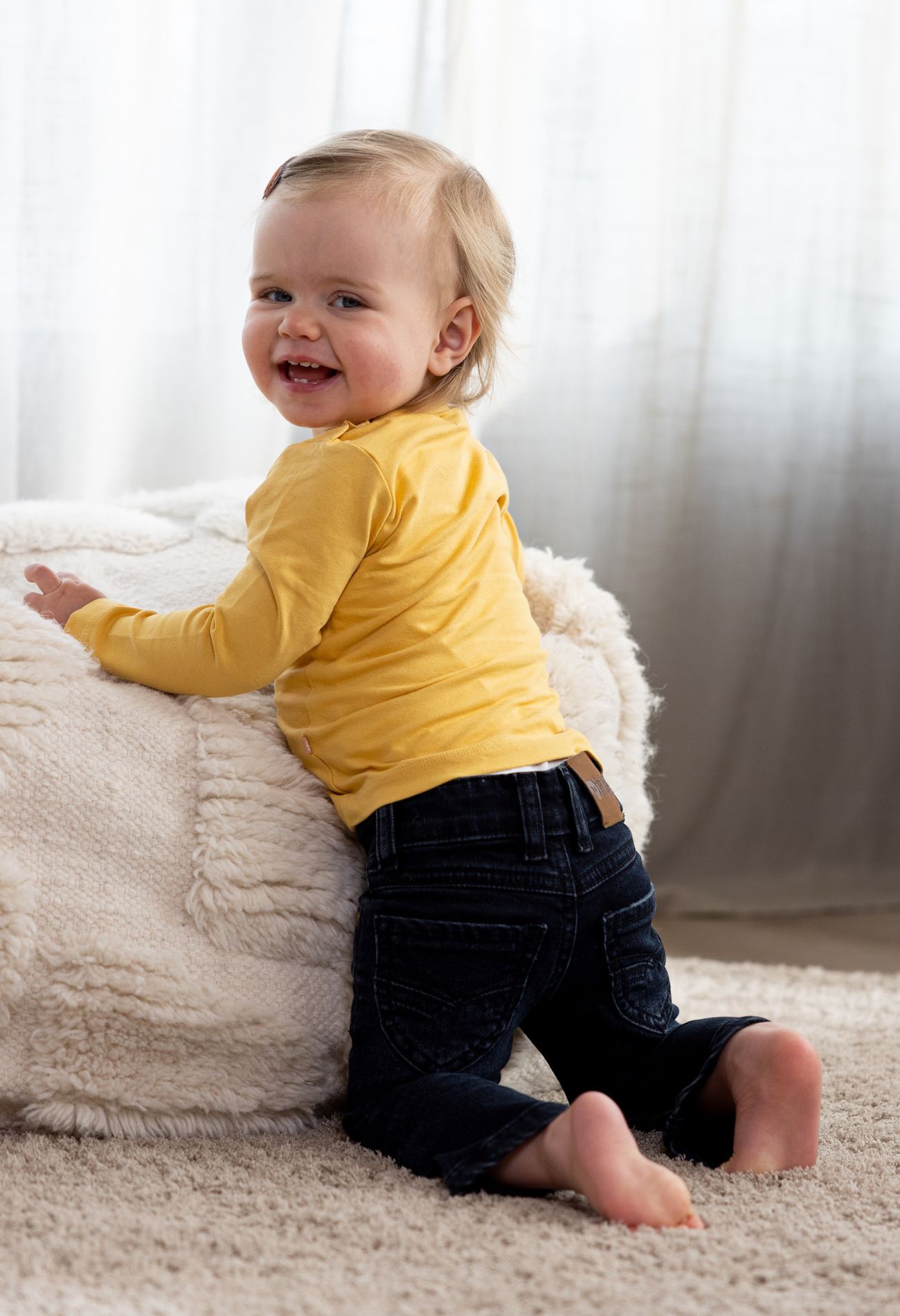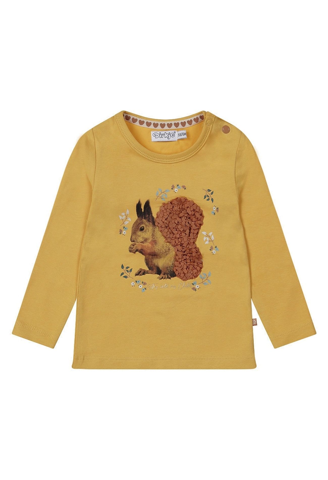 Stay wild my child! Dit okergele shirt voor baby meisjes heeft een ontzettend leuke eekhoorn print met een leuk effect op de staart. Daar zal jouw meisje helemaal gek op zijn!