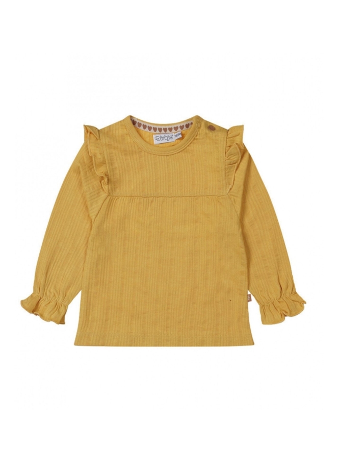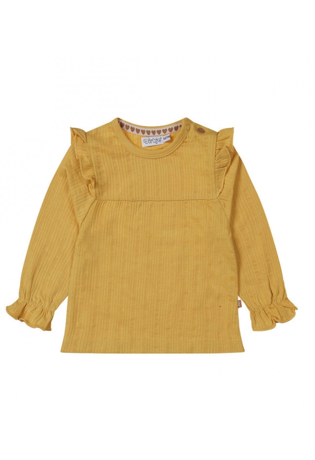 Dit vrolijke shirt van Dirkje laat jouw meisje stralen! Okergeel is super te combineren met natuurlijke tinten zoals bruin en ecru. Dit blousemodel heeft mooie ruches over de schouder.
