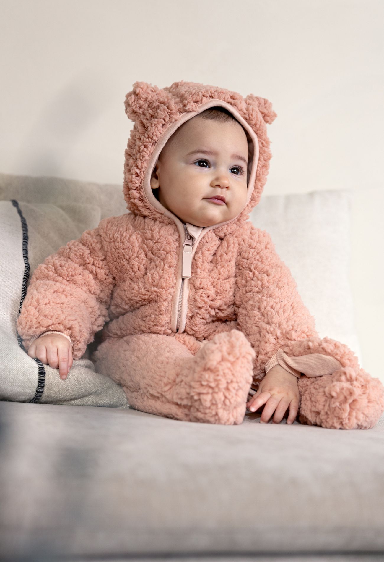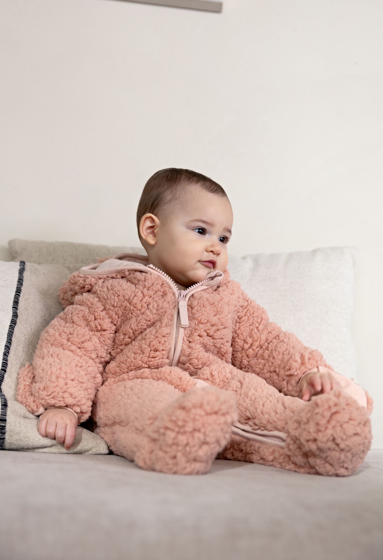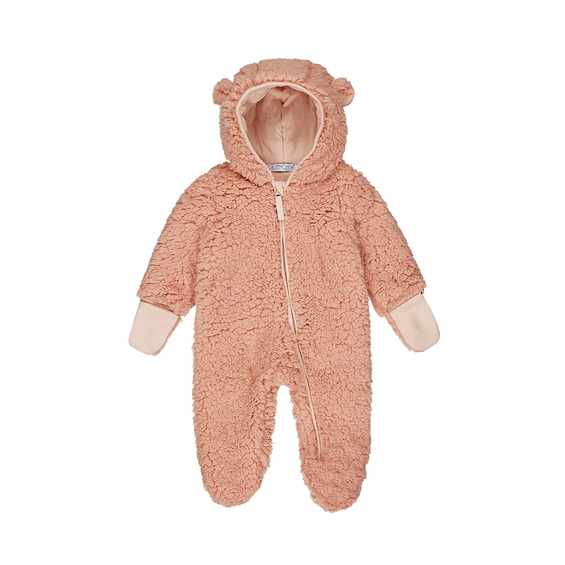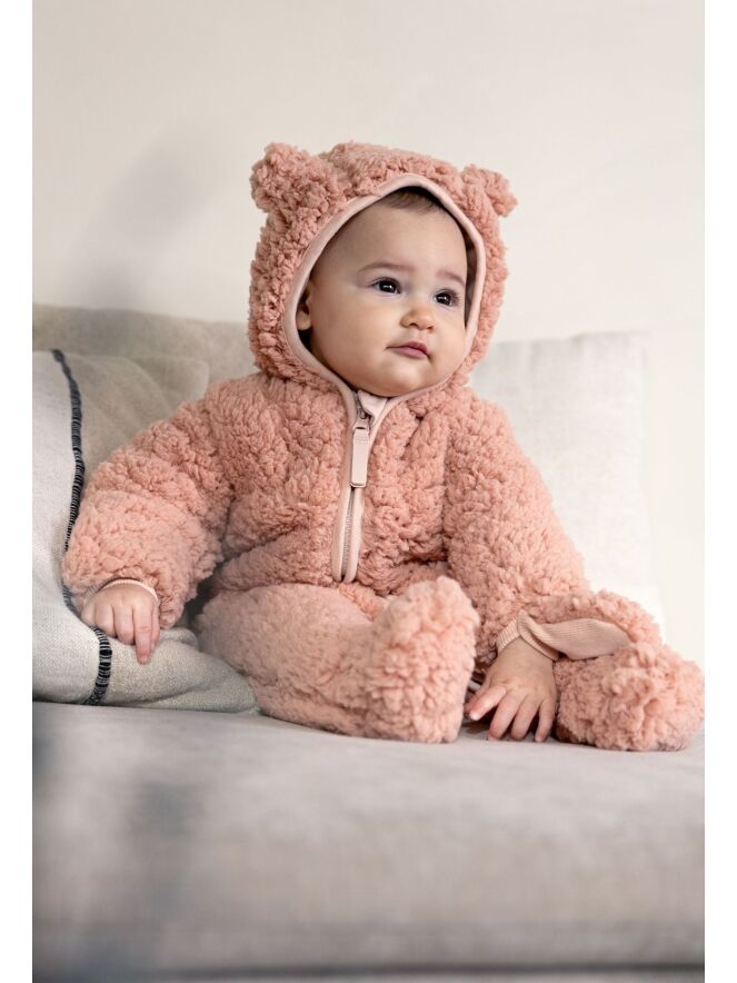 Warm, warmer, deze is het warmst! Deze onesie of jumpsuit voor baby's heeft een capuchon met schattige oortjes, aangestikte handwarmers en is heerlijk zacht. Je trekt hem makkelijk aan door de rits die doorloopt van boven tot onderkant voet.