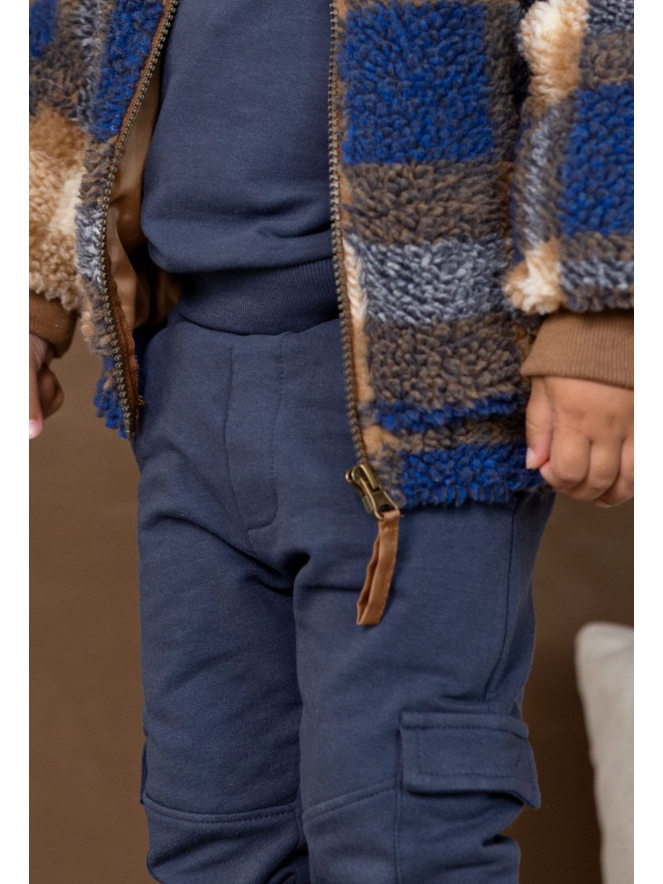 Stoer sweat baby jongens broekje met zakken op de zijkant. Met nonchalante steekzakjes en een hout look knoop op de elastische tailleband.