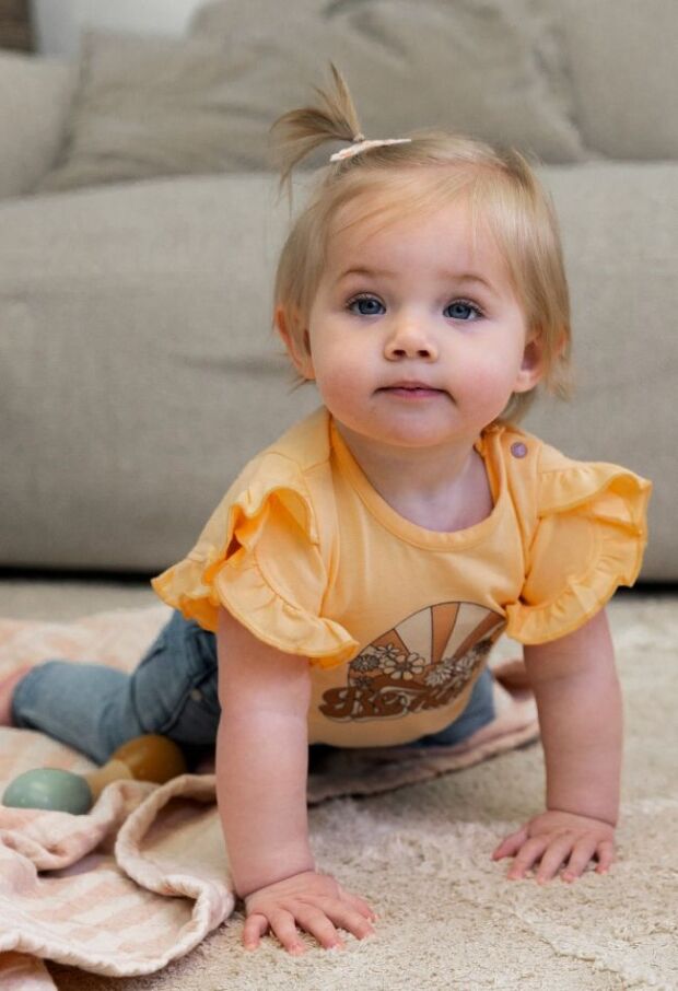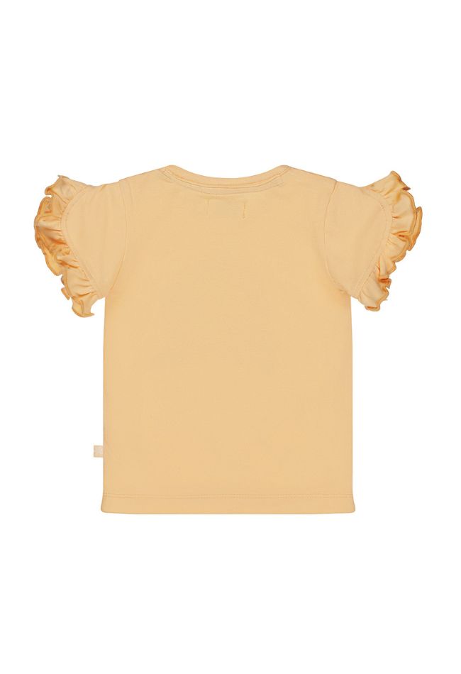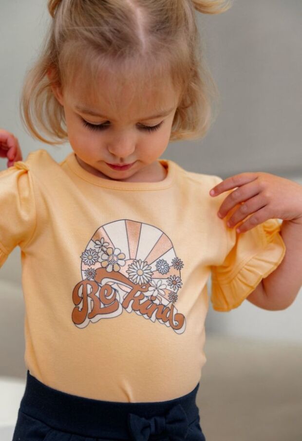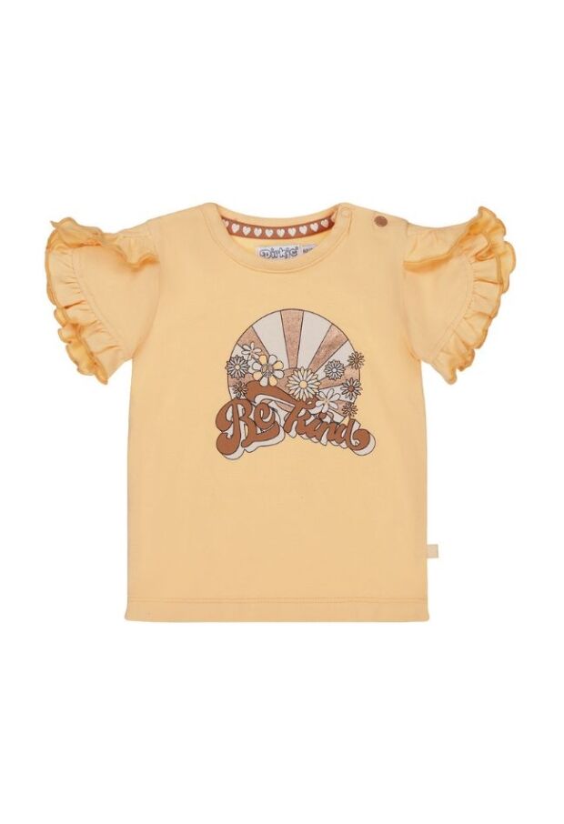 Dit T-shirtje met kelkmouwtje heeft een Be Kind print op de voorkant.