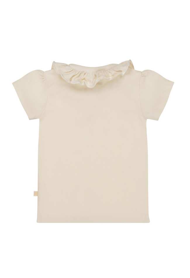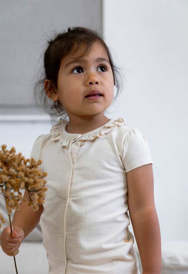 Dit T-shirt heeft drukknoopjes aan de voorkant met een ruche om de hals.