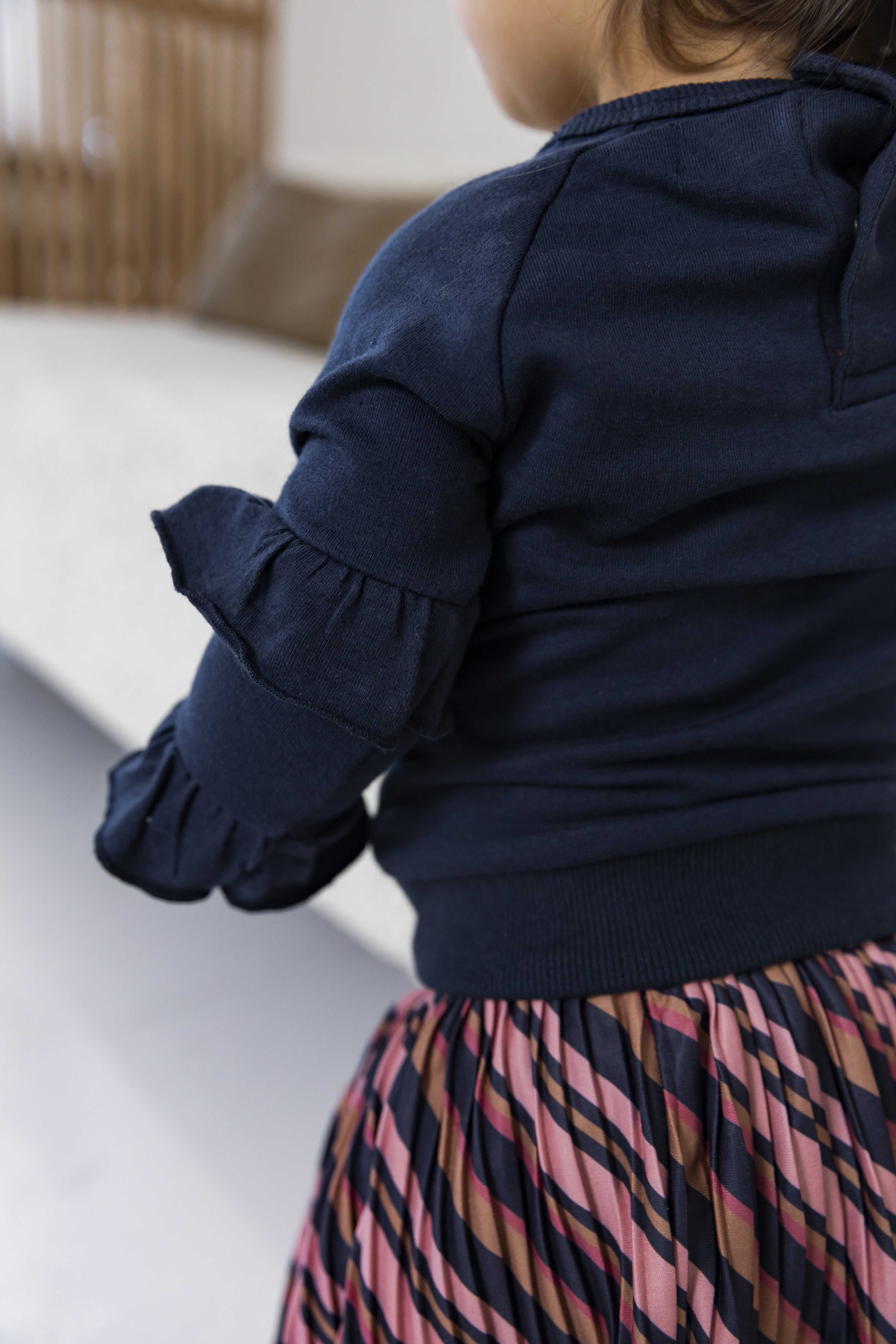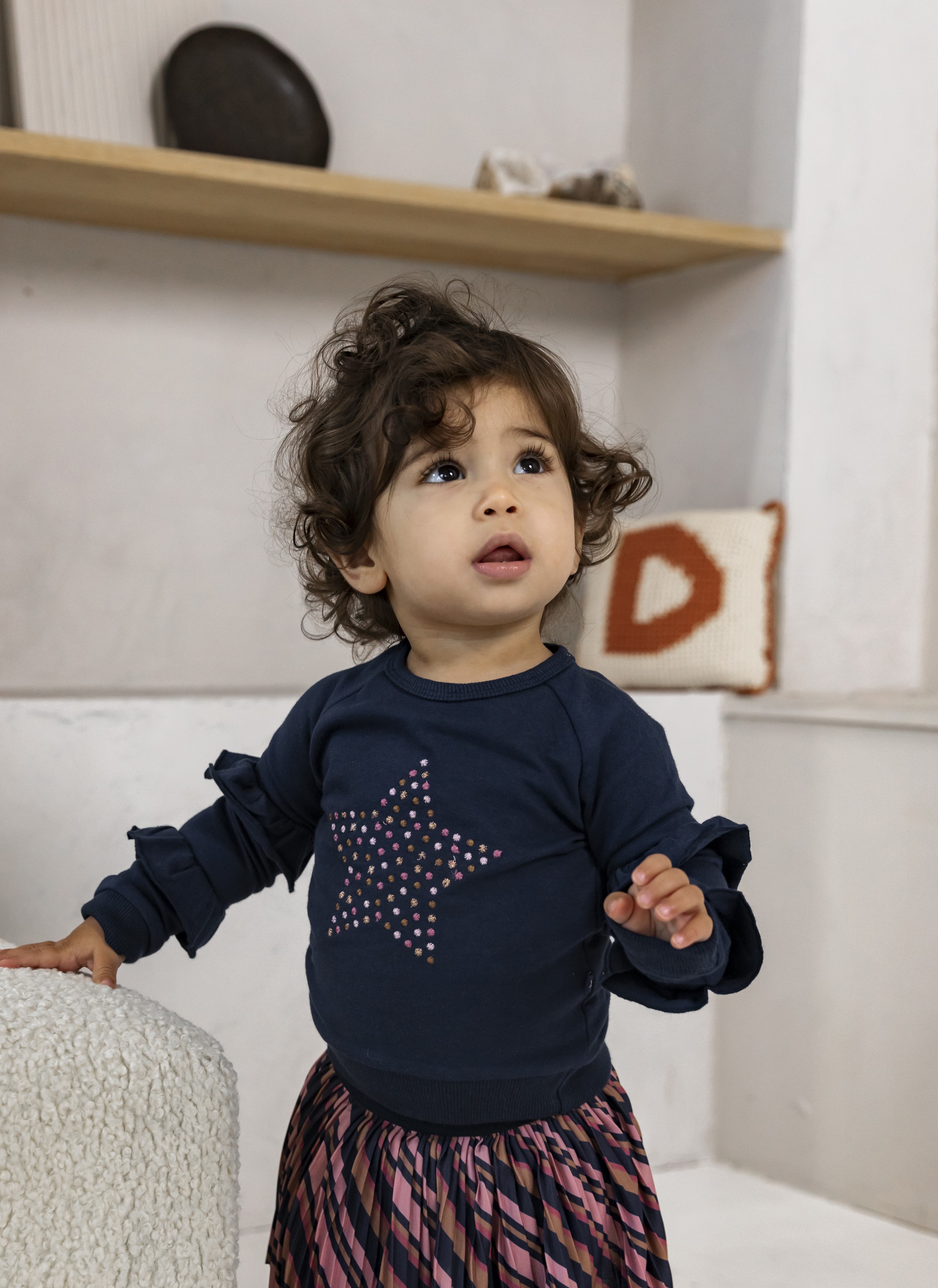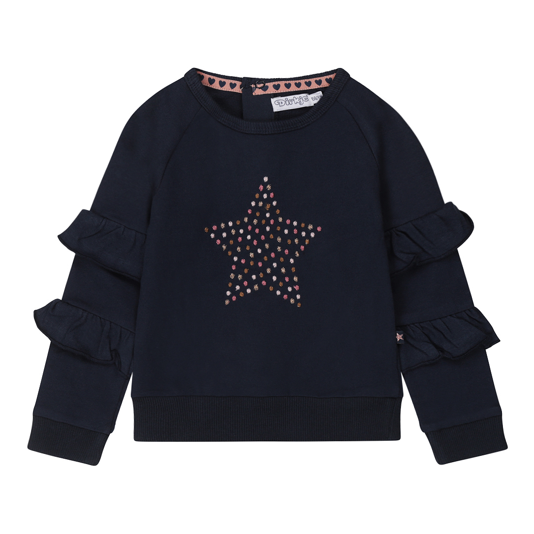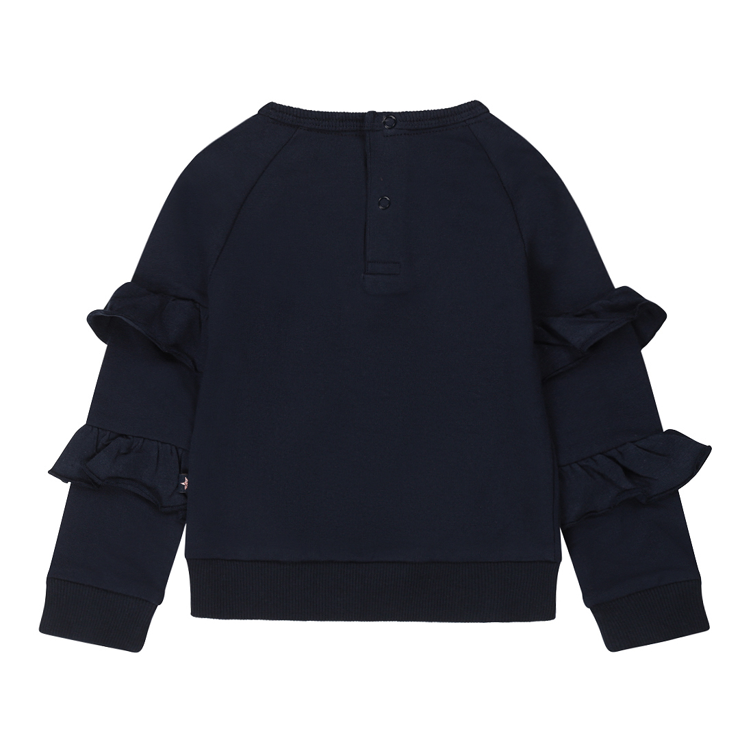 Sweater voor baby meisjes met dubbele ruches op de mouwen en een geborduurde ster op de voorkant. De kleine maatjes hebben 2 drukknoopjes op de rug.