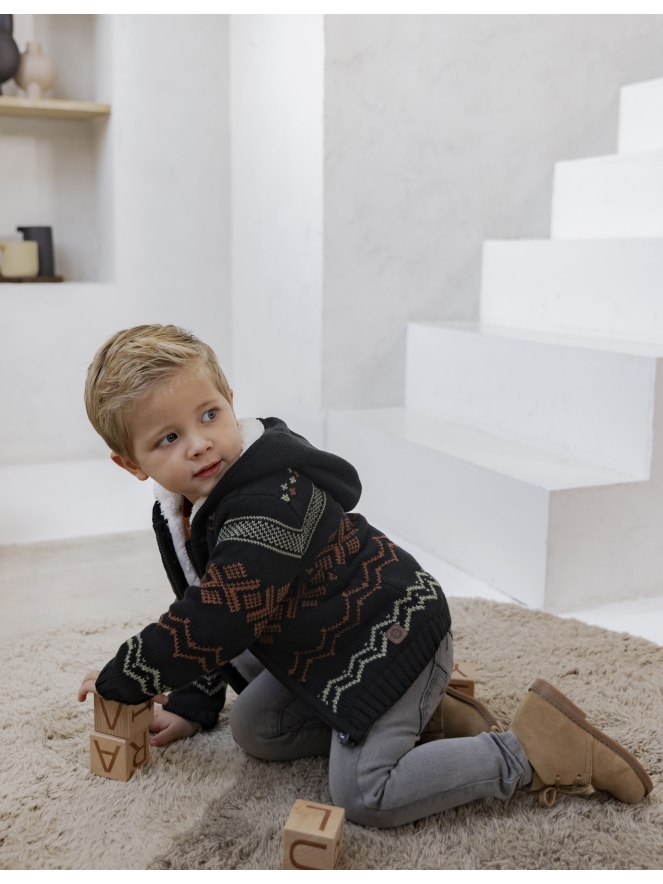 Warm baby jongens vest gevoerd met teddy. Dit vest heeft een capuchon en een stoere Noorse uitstraling.