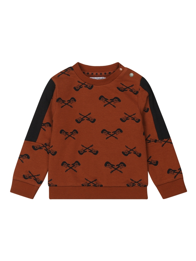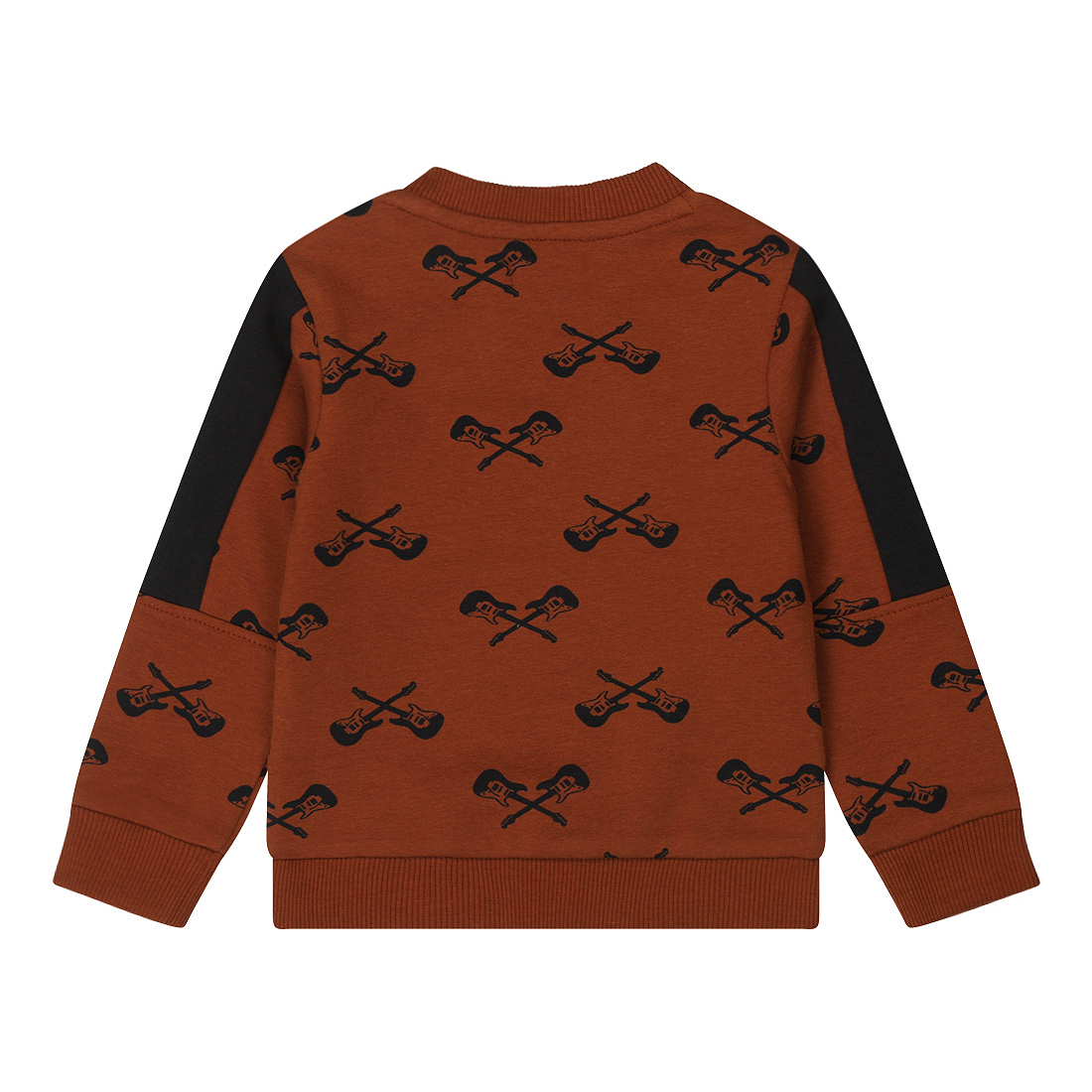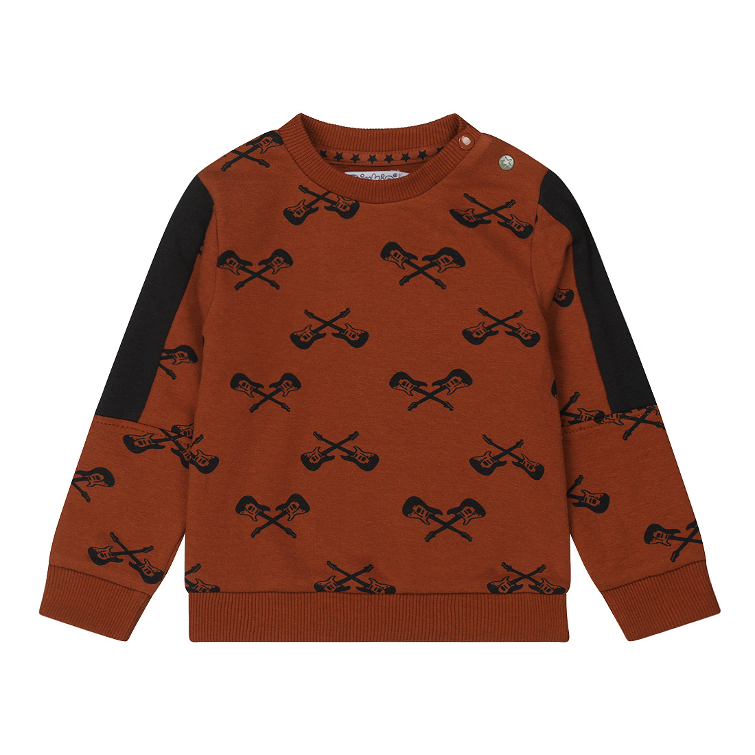 Sweater voor baby jongens met een allover gitaren print. De kleinste maten hebben 2 drukknopen op de schouder.