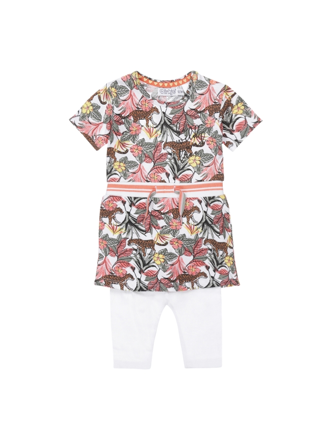 Deze 2-delige set bestaat uit een jurk met een allover jungleprint een bijpassende haarband en een witte legging.