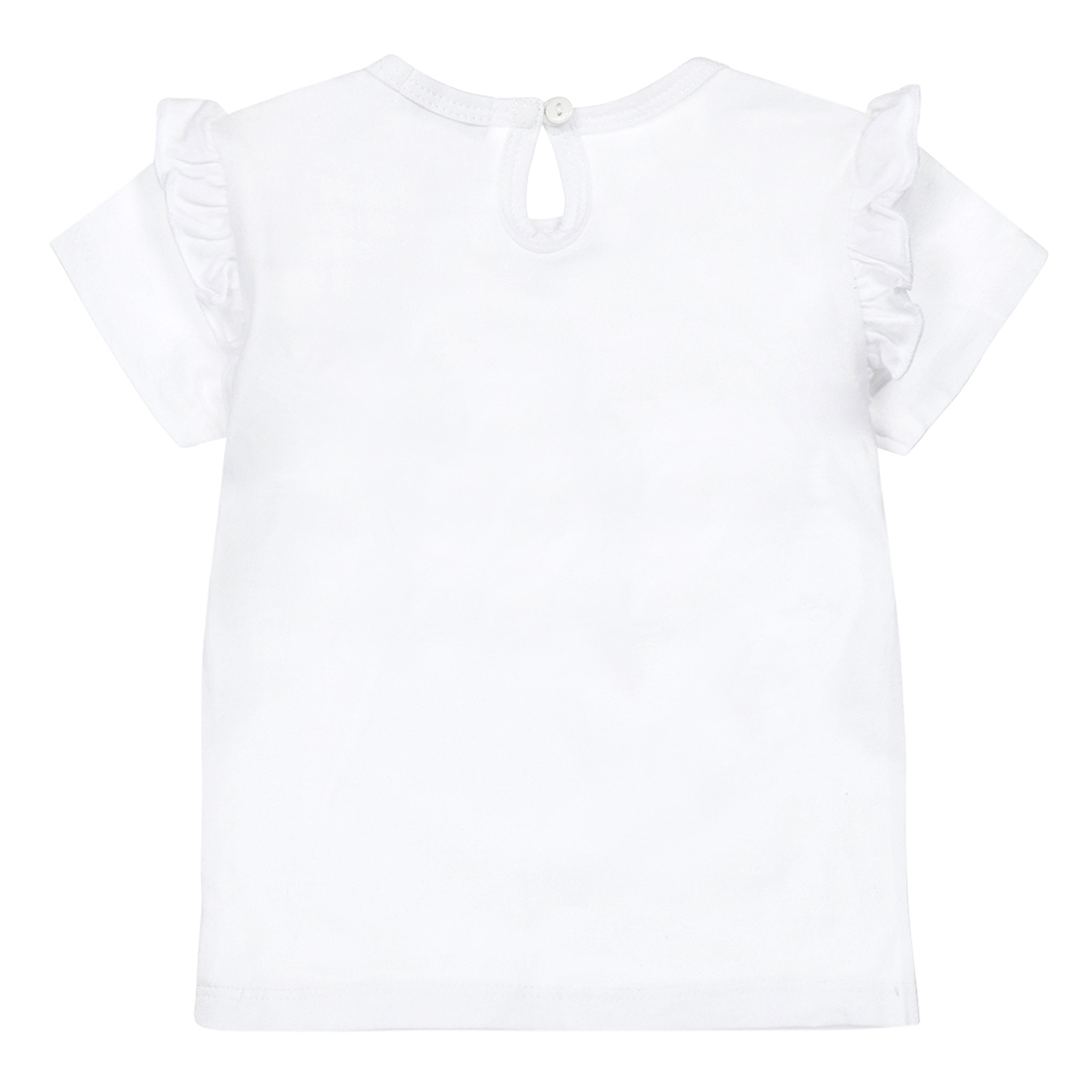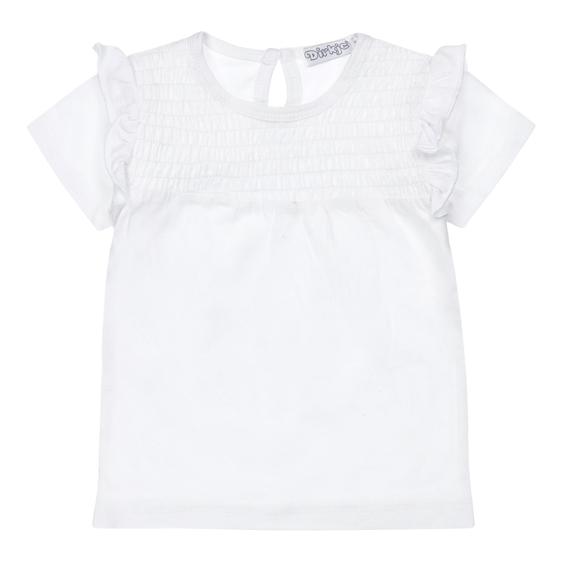 T-shirt met korte mouwen en ruche op de schouders. Het t-shirt is aan de bovenkant gemokt.