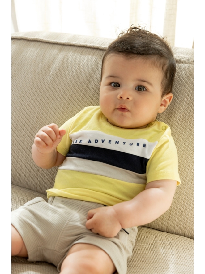 Dit 2-delige set bestaat uit een t-shirt met korte mouwen en een ronde hals. Op de voorkant zit een tekst opdruk. Bij de kleinste maten zitten drukknopen op de schouder. Het short gemaakt van ribstof heeft een elastische taille met een sier koord. Aan de voorkant zitten twee neppe steekzakken.
