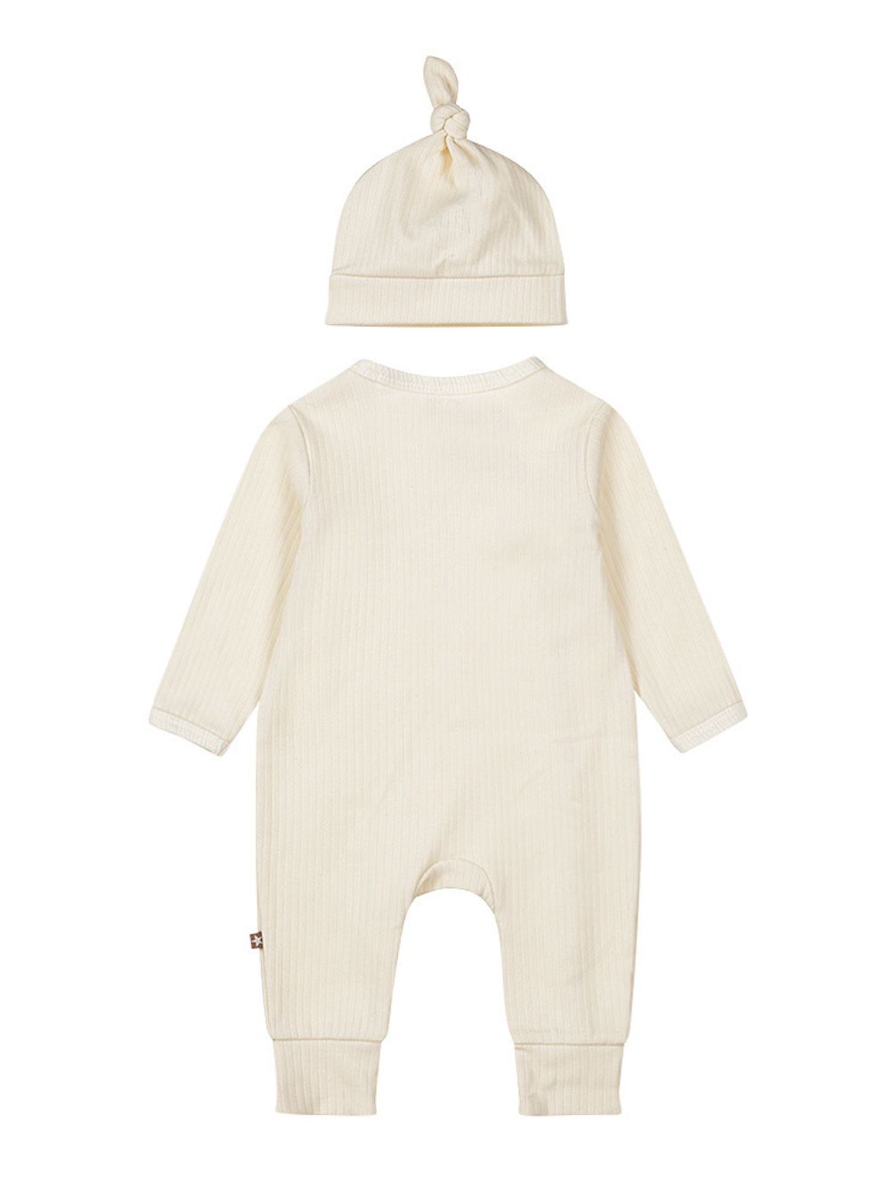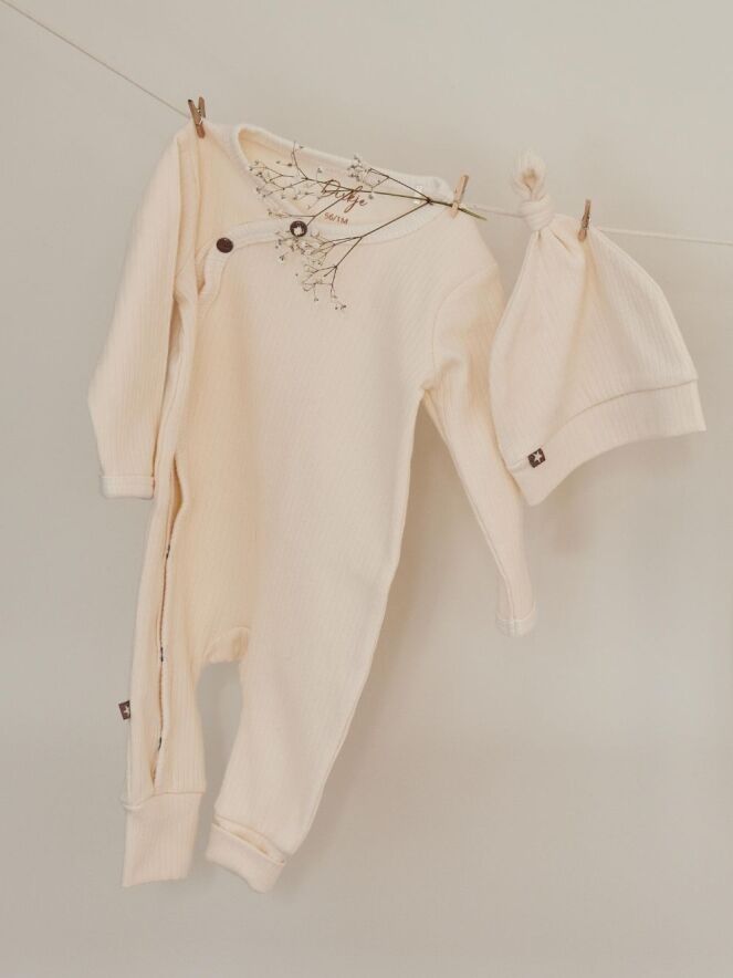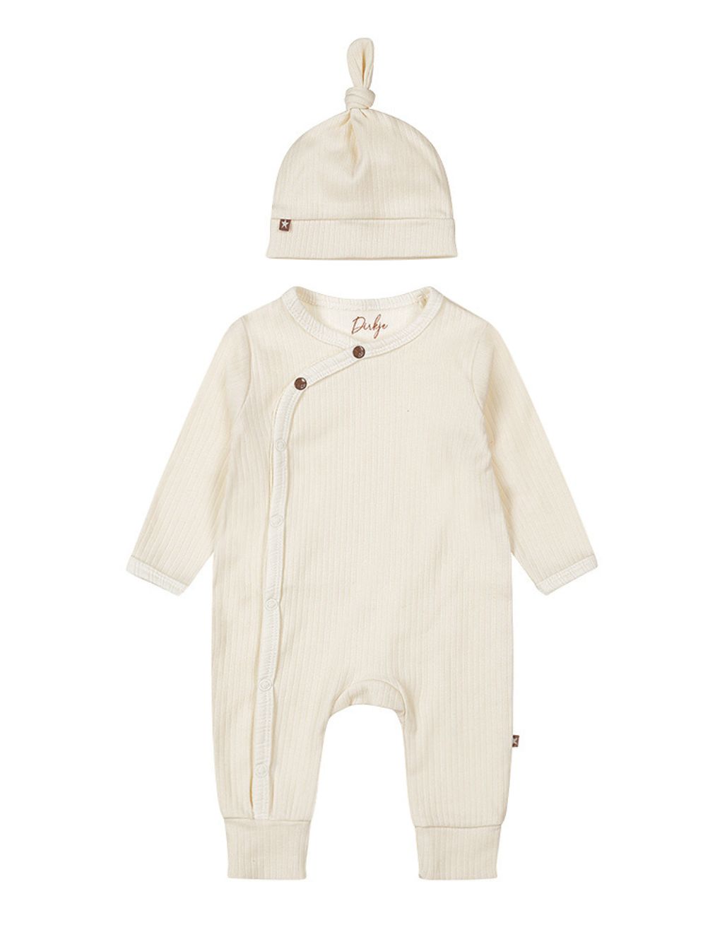 2 Delige set van Dirkje bestaande uit een romper met overslag en bijpassend knoopmutsje. De romper heeft een leuke details zoals de overslag met 2 bruine ster drukkers. Maar ook een omgeslagen broekspijpje. Gemaakt van organic cotton, goed voor iedere newborn maar ook voor het milieu.