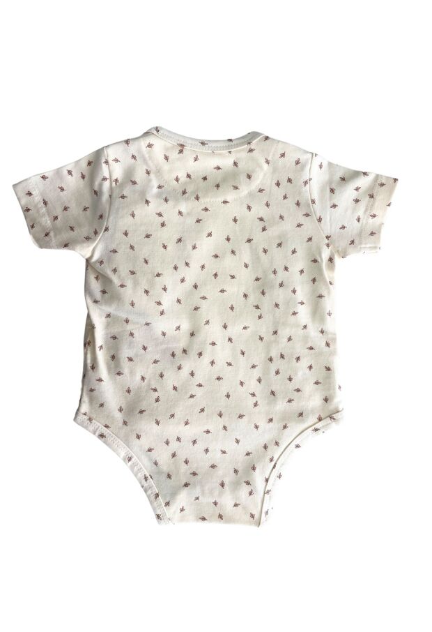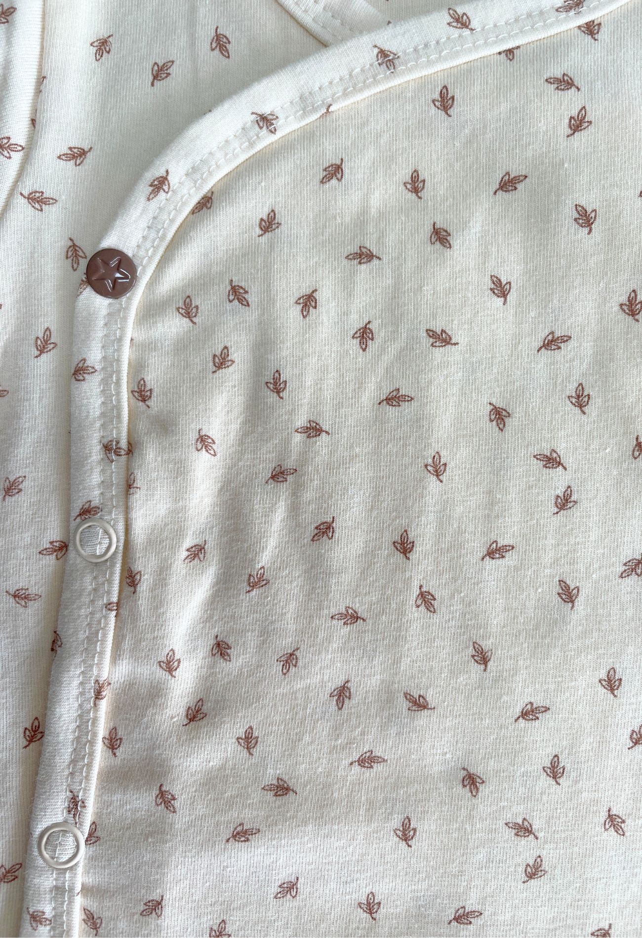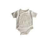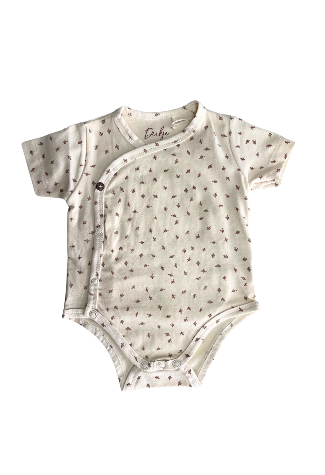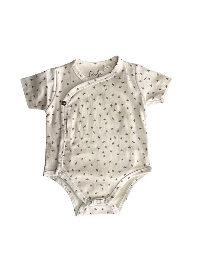 Deze overslag romper heeft een korte mouw en is zeer geschikt voor deze tijd van het jaar! Van 95% Organisch katoen, verantwoordt voor jouw kleintje en voor het milieu! Let op: De kleur off white heeft een kleine rib in de stof. De kleur zand heeft geen rib in de stof maar een kleine tekstprint.