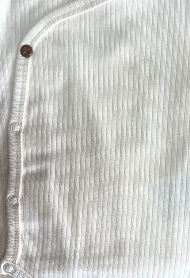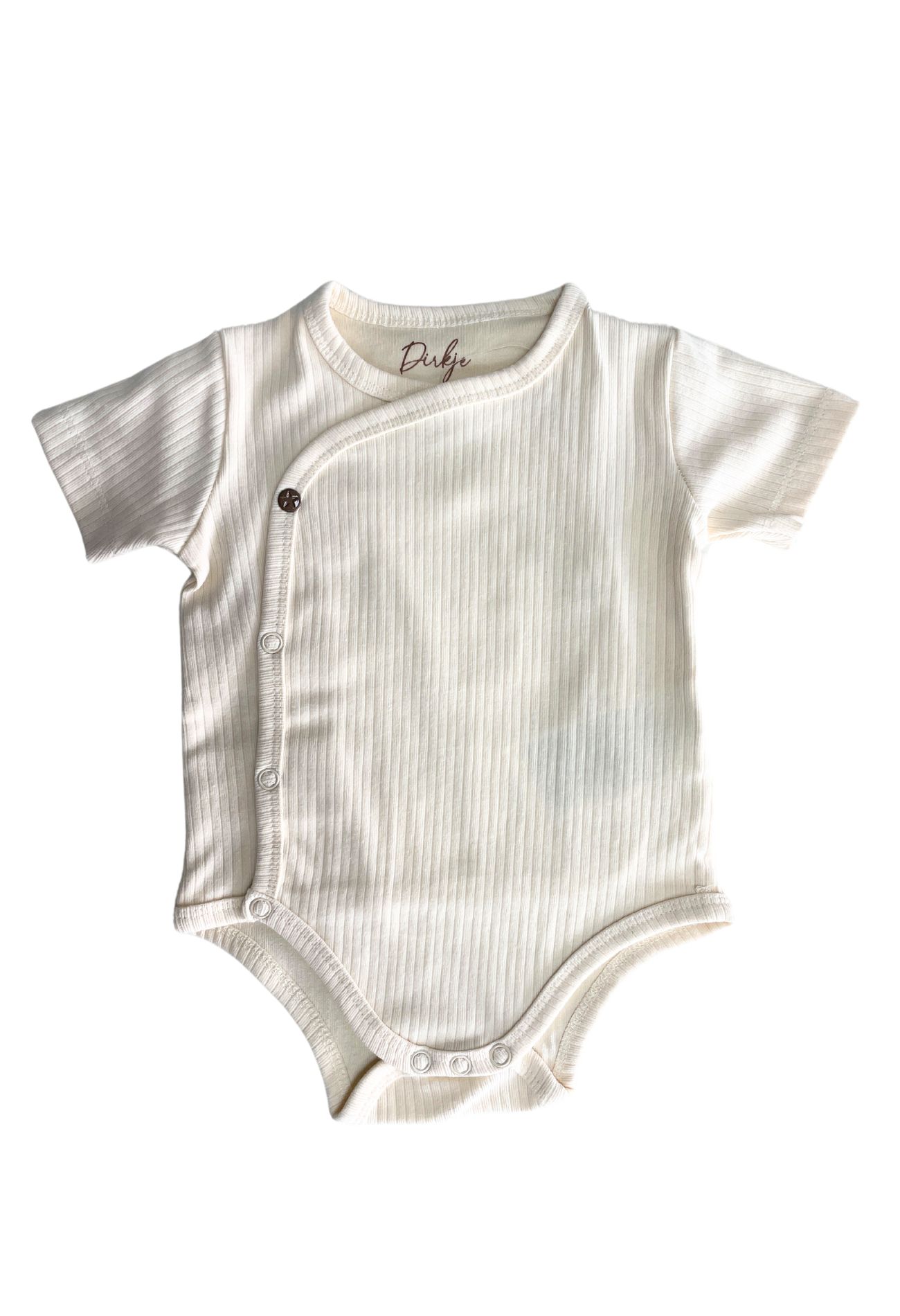 Deze overslag romper heeft een korte mouw en is zeer geschikt voor deze tijd van het jaar! Van 95% Organisch katoen, verantwoordt voor jouw kleintje en voor het milieu! Let op: De kleur off white heeft een kleine rib in de stof. De kleur zand heeft geen rib in de stof maar een kleine tekstprint.