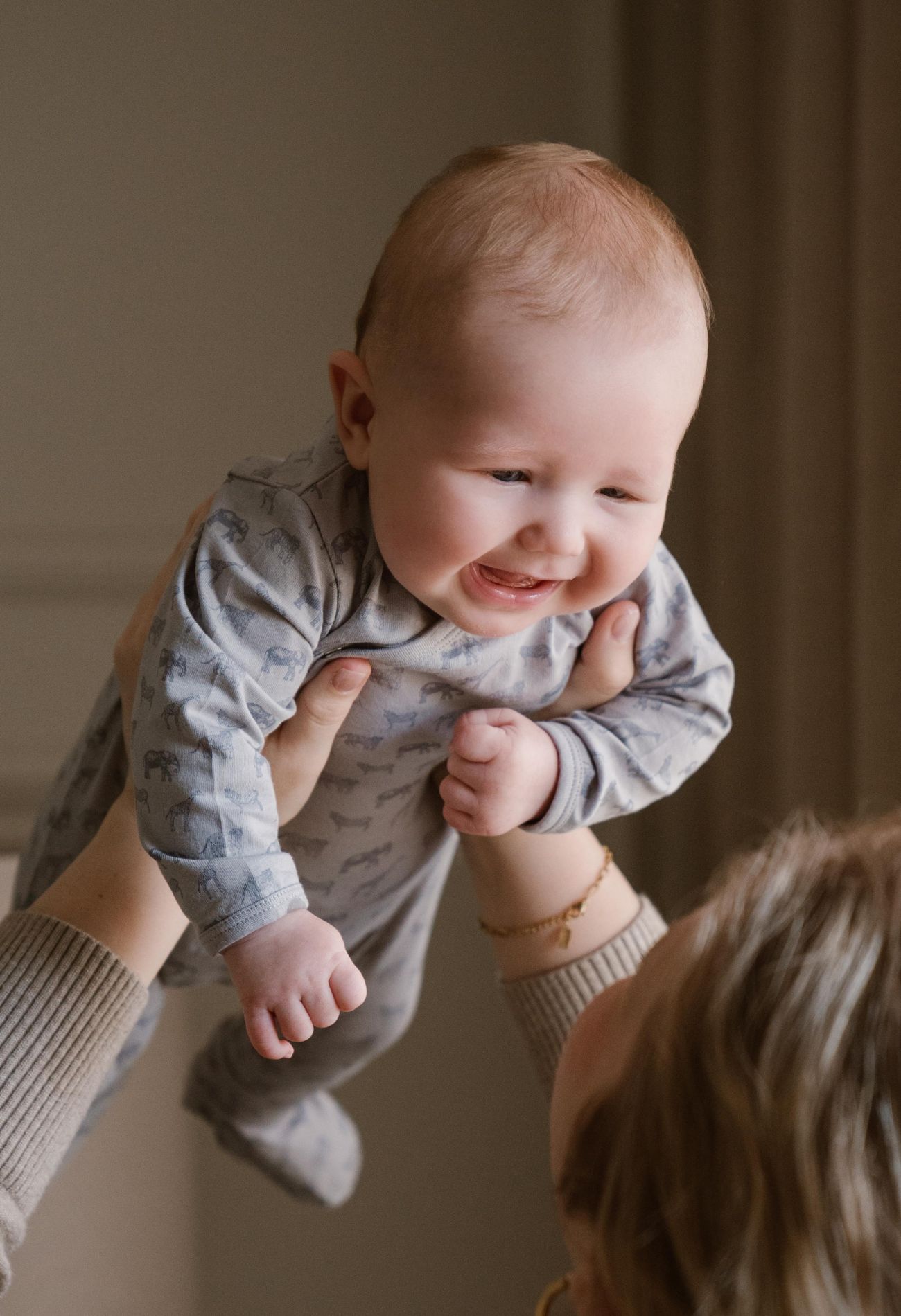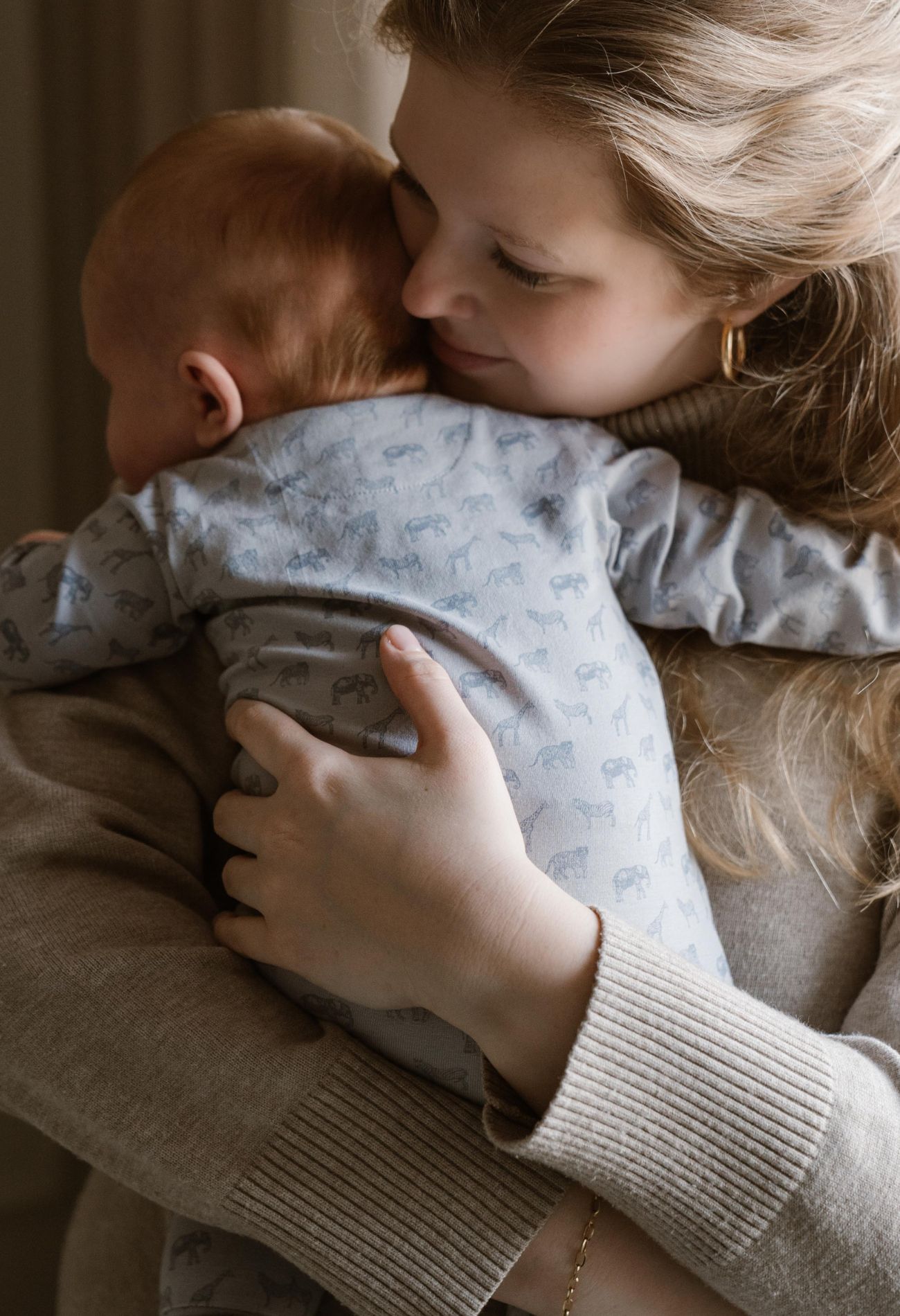 Dit leuke setje van Dirkje voor new born boys bestaat uit een pakje met bijpassende slofjes. De kleur van de stof zit tussen grijs en blauw in en heeft een print met safari dieren.