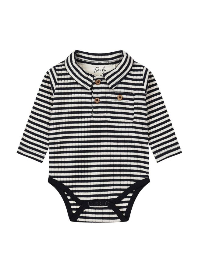 Heerlijke overslag romper met tijdloos streeppatroon van Dirkje. Voorop zitten twee hout look knoopjes en uiteraard drukknoopjes bij het kruis. Het materiaal is rekbaar en van organic cotton. Dat is katoen geteeld op een milieuvriendelijke manier. Dat wil je toch?