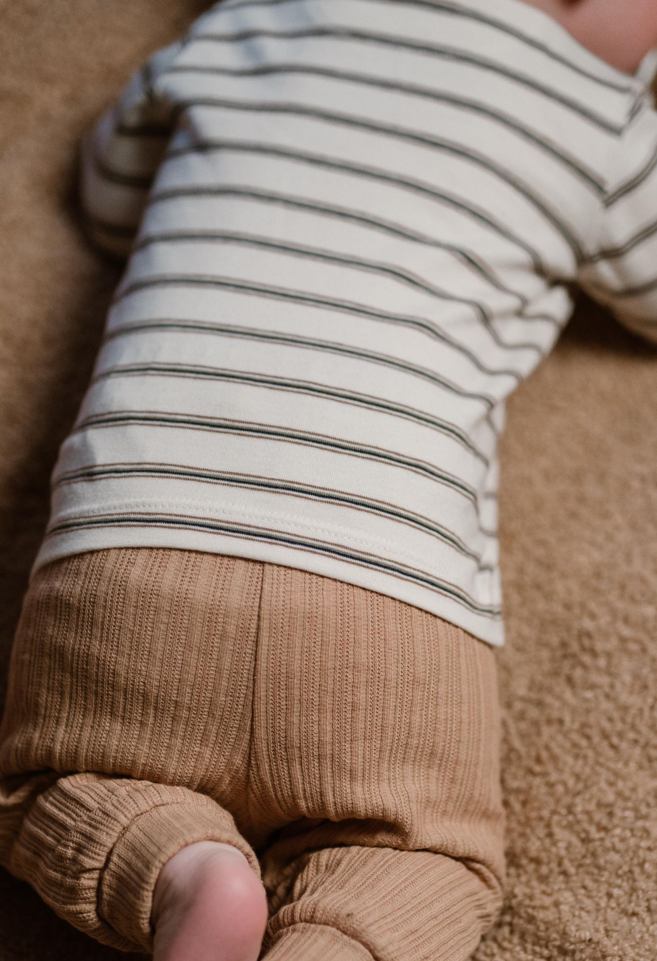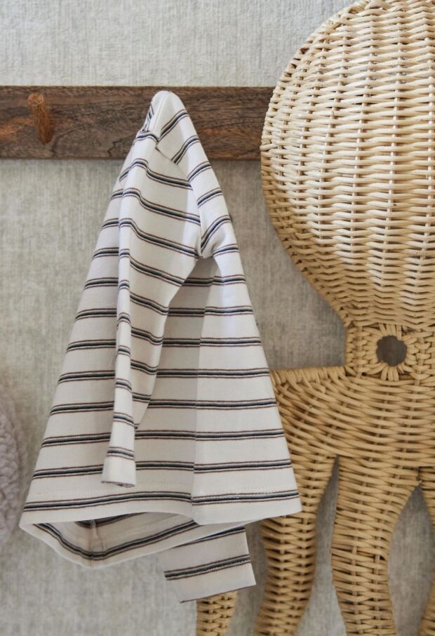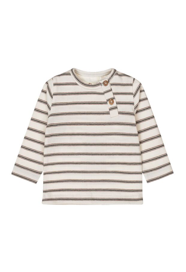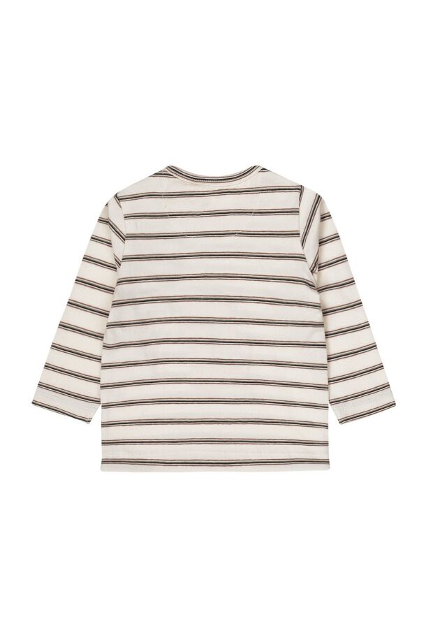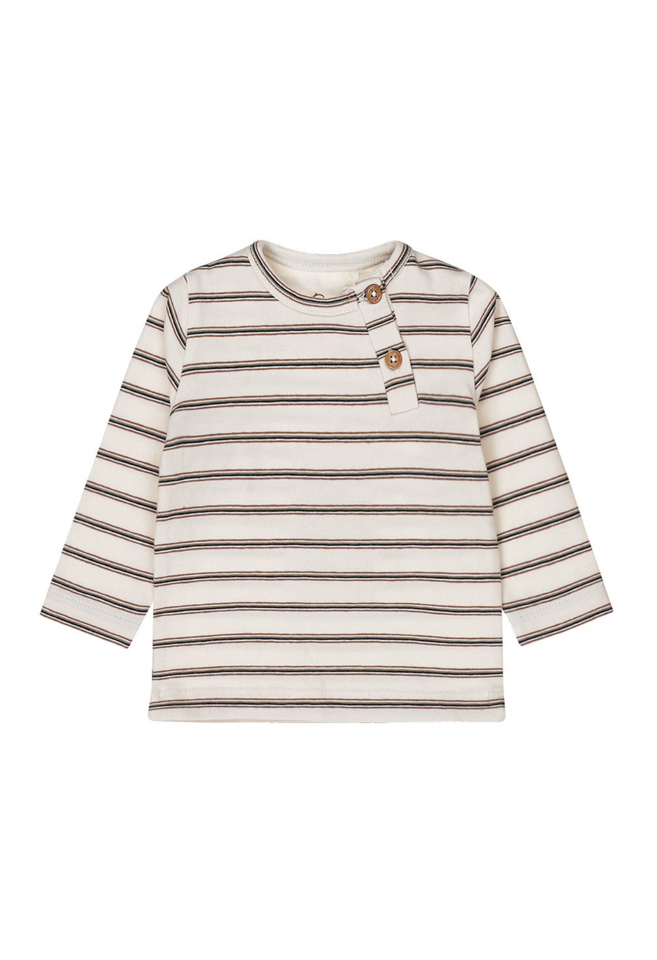 Dit mooie serafino shirt van Dirkje vervaardigd uit 95% organisch katoen heeft een bruin grijs zwart streepjes motief en houtlook knoopjes.