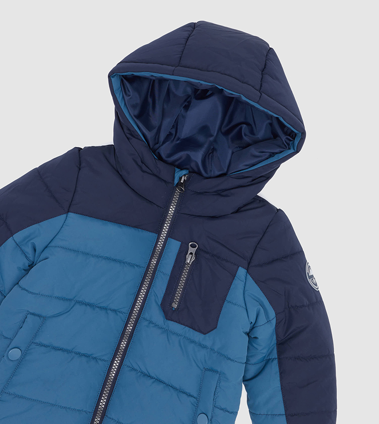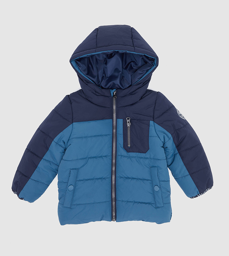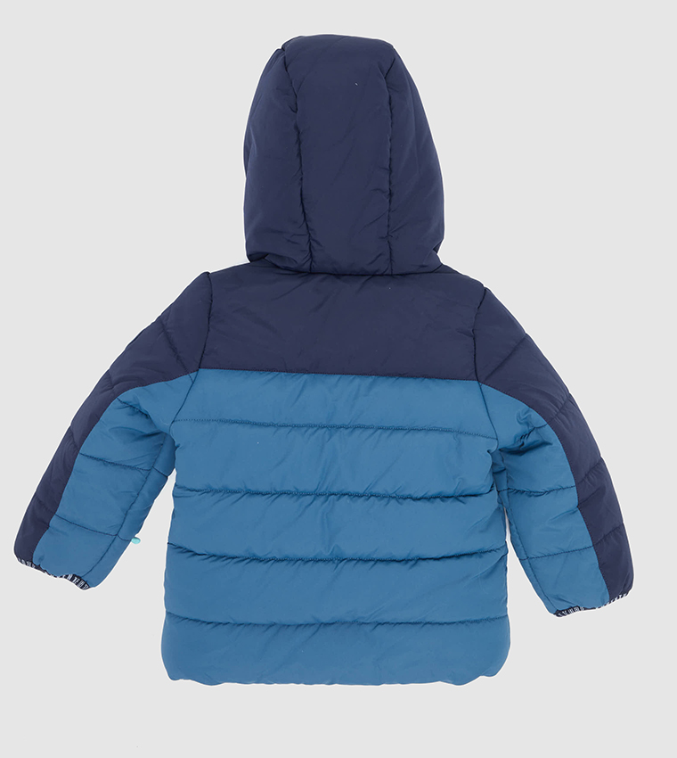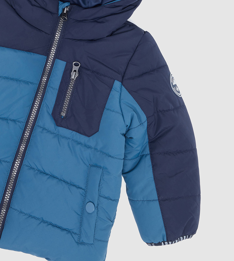 Winterjas voor baby jongens in de kleurstelling petrol - donkerblauw. Deze jas heeft 3 zakken en een vaste capuchon. Aan het uiteinde van de mouwen zit een bies met daarop de tekst adventure. Deze jas is ook verkrijgbaar voor jongens vanaf maat 92.