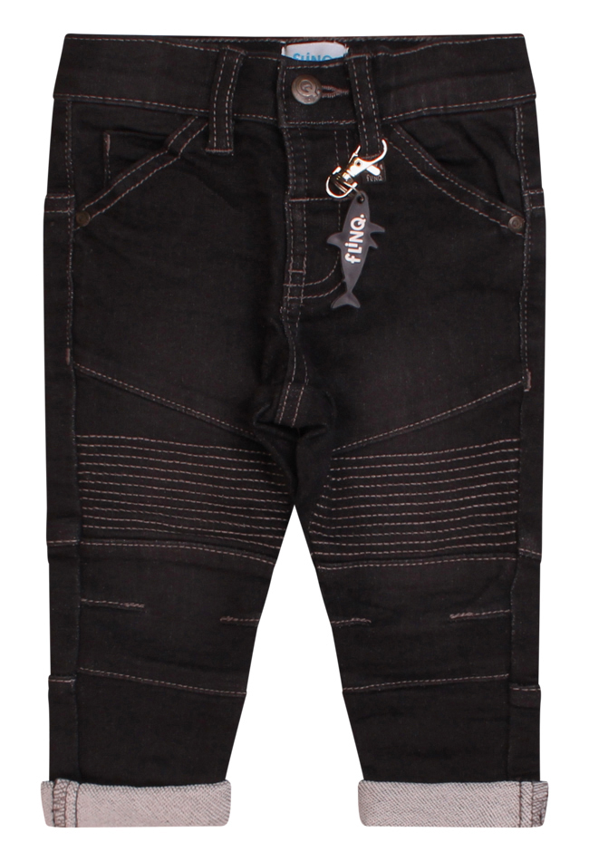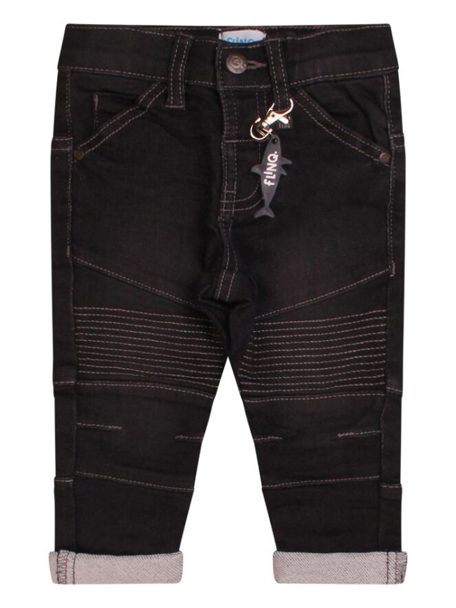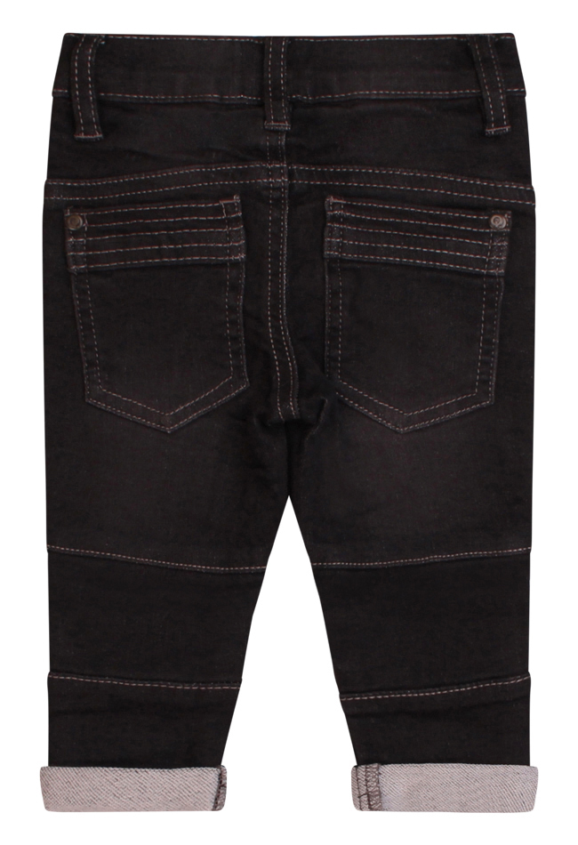 Stoere sweat denim jeans voor baby boys. Deze 5 pocket sluit met een haak sluiting en heeft stoere stiksels en details. De lengte nog wat lang? Sla de broekspijp dan even om. Zo heb je een broekje op de groei want ook de taille is gewoon te verstellen. Met leuke haai sleutelhanger!