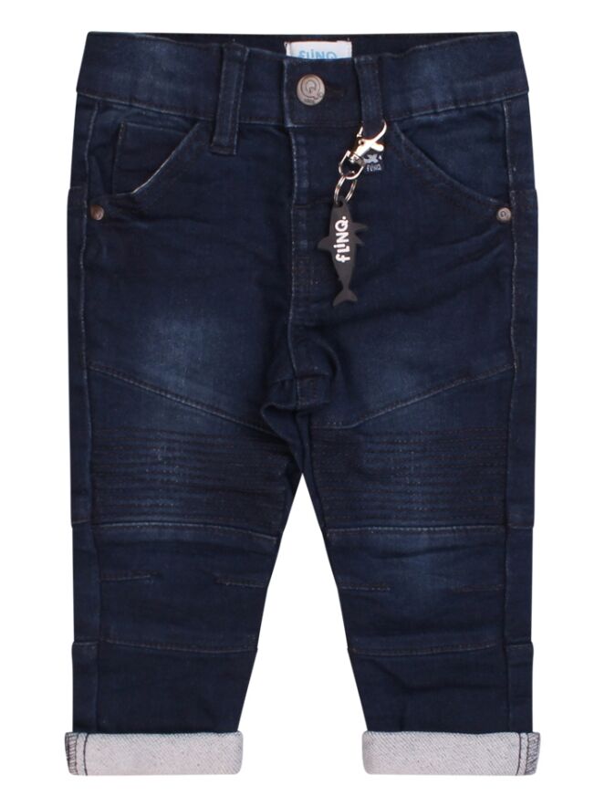 Stoere sweat denim jeans voor baby boys. Deze 5 pocket sluit met een haak sluiting en heeft stoere stiksels en details. De lengte nog wat lang? Sla de broekspijp dan even om. Zo heb je een broekje op de groei want ook de taille is gewoon te verstellen. Met leuke haai sleutelhanger!
