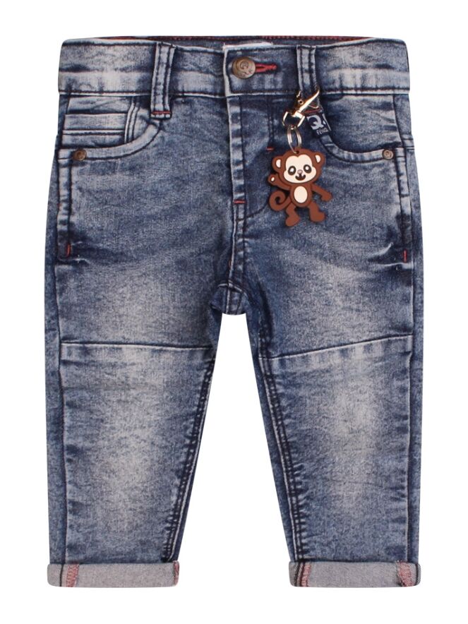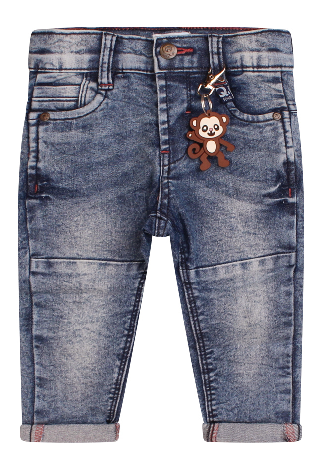 Mooie stretch jeans voor baby boys. Deze 5 pocket sluit met een haak sluiting en is verder vrij basic en neutraal. De lengte nog wat lang? Sla de broekspijp dan even om. Zo heb je een broekje op de groei want ook de taille is gewoon te verstellen. Met leuke aap sleutelhanger!