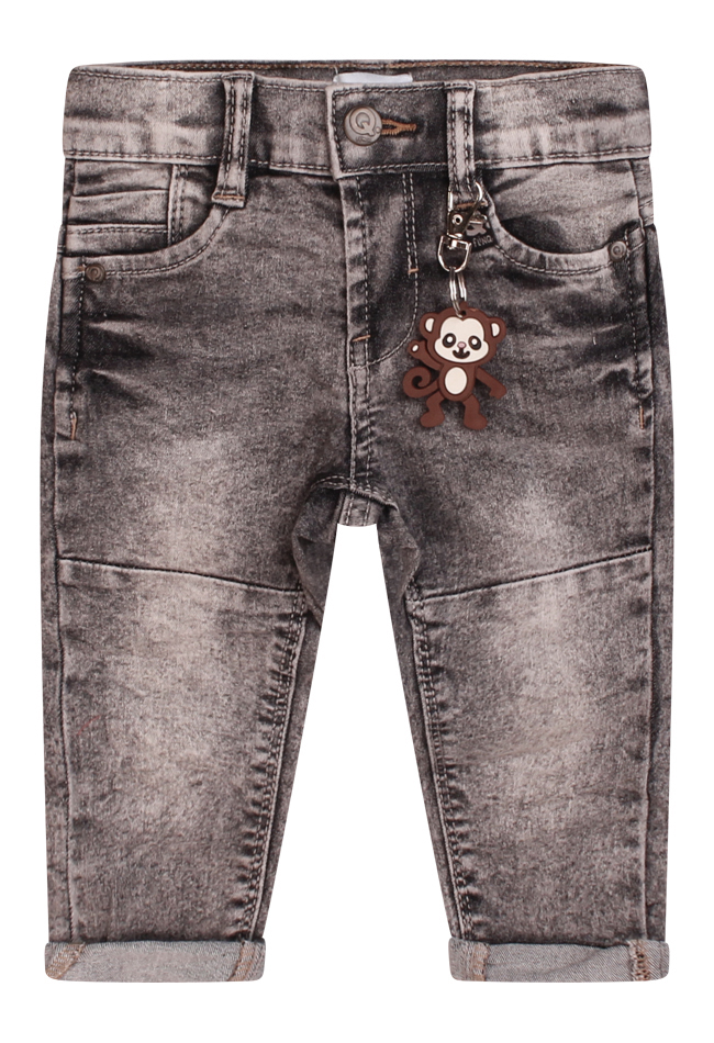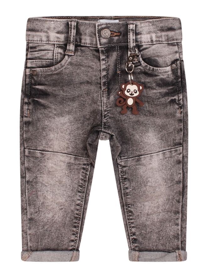 Mooie stretch jeans voor baby boys. Deze 5 pocket sluit met een haak sluiting en is verder vrij basic en neutraal. De lengte nog wat lang? Sla de broekspijp dan even om. Zo heb je een broekje op de groei want ook de taille is gewoon te verstellen. Met leuke aap sleutelhanger!