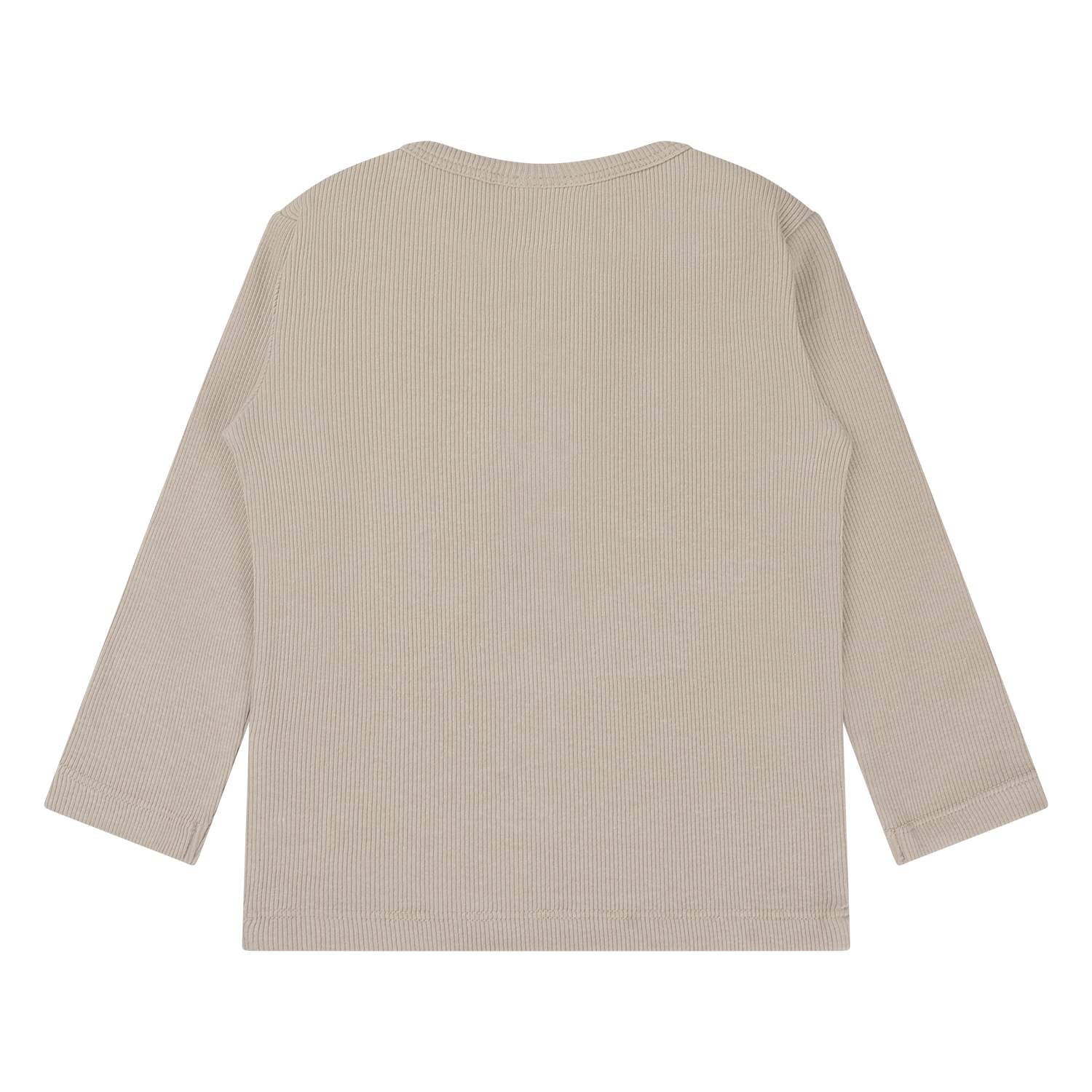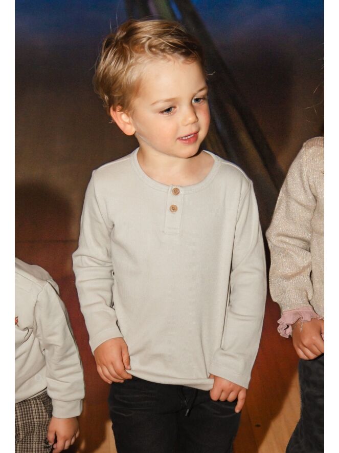 Effen serafino top met lange mouwen voor baby boys! Dit basic shirt hebben we in meerdere verschillende rustige kleuren. Met een kleine rib in de stof en lekker stretchy voor een hoog comfort gehalte.
