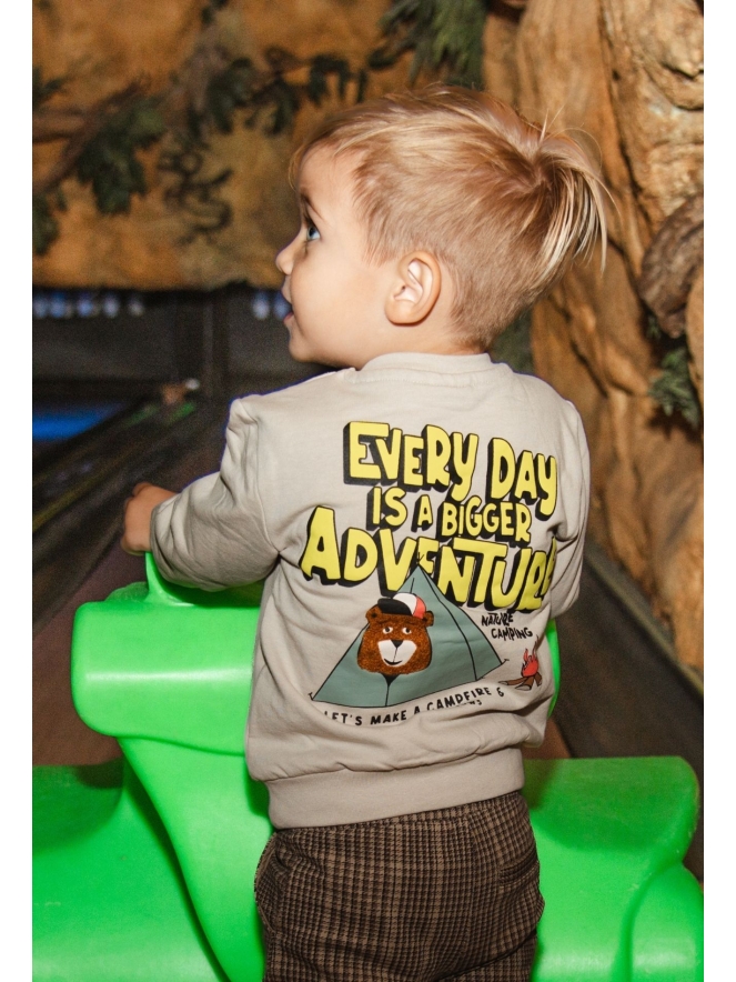 Voor de kleine avonturiers hebben we een hele leuke sweater! Every day is a bigger adventure! Toast marshmallows!! Jumjum!